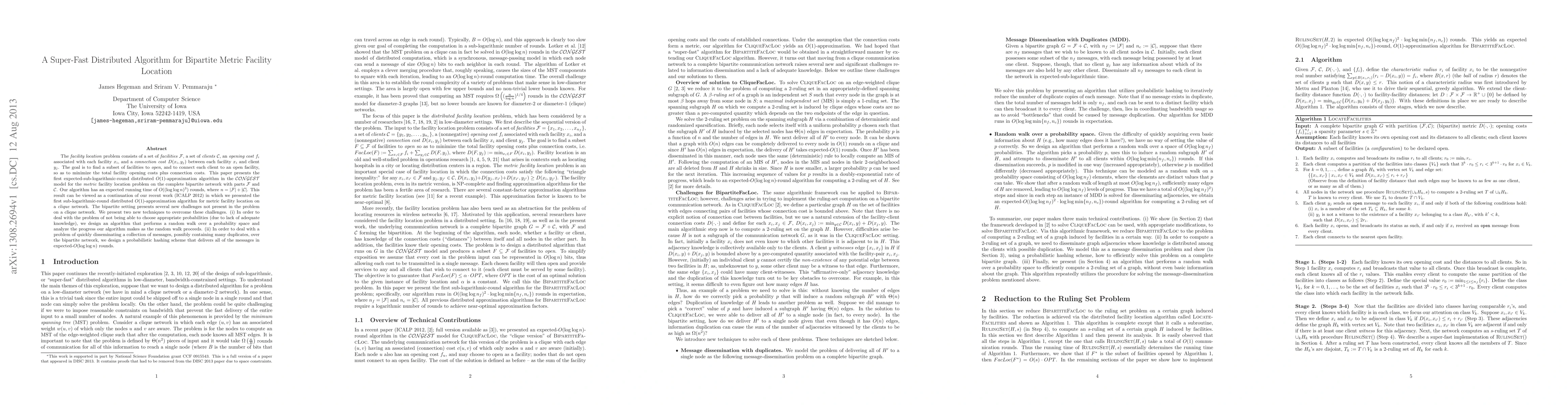 This paper introduces a novel distributed algorithm achieving an expected-sub-logarithmic-round O(1)-approximation for the metric facility location problem on complete bipartite networks. The algorithm runs in O((log log n)^3) rounds and employs two new techniques: a random walk-based approach to handle probability selection and a probabilistic hashing scheme for efficient message dissemination.