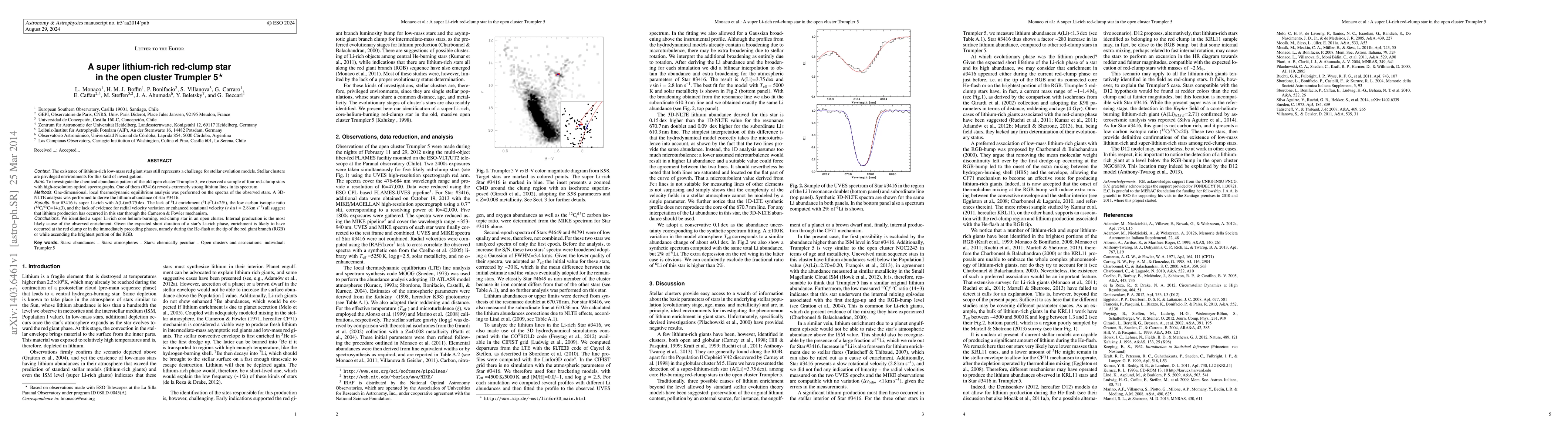 Context. The existence of lithium-rich low-mass red giant stars still represents a challenge for stellar evolution models. Stellar clusters are privileged environments for this kind of investigation. Aims. To investigate the chemical abundance pattern of the old open cluster Trumpler\,5, we observed a sample of four red-clump stars with high-resolution optical spectrographs. One of them (#3416) reveals extremely strong lithium lines in its spectrum. Methods. One-dimensional, local thermodynamic equilibrium analysis was performed on the spectra of the observed stars. A 3D-NLTE analysis was performed to derive the lithium abundance of star #3416. Results. Star #3416 is super Li-rich with A(Li)=3.75\,dex. The lack of $^6$Li enrichment ($^6$Li/$^7$Li$<$2%), the low carbon isotopic ratio ($^{12}$C/$^{13}$C=14$\pm$3), and the lack of evidence for radial velocity variation or enhanced rotational velocity ($v\sin i = 2.8\,$\kms) all suggest that lithium production has occurred in this star through the Cameron & Fowler mechanism. Conclusions. We identified a super Li-rich core helium-burning, red-clump star in an open cluster. Internal production is the most likely cause of the observed enrichment. Given the expected short duration of a star's Li-rich phase, enrichment is likely to have occurred at the red clump or in the immediately preceding phases, namely during the He-flash at the tip of the red giant branch (RGB) or while ascending the brightest portion of the RGB.