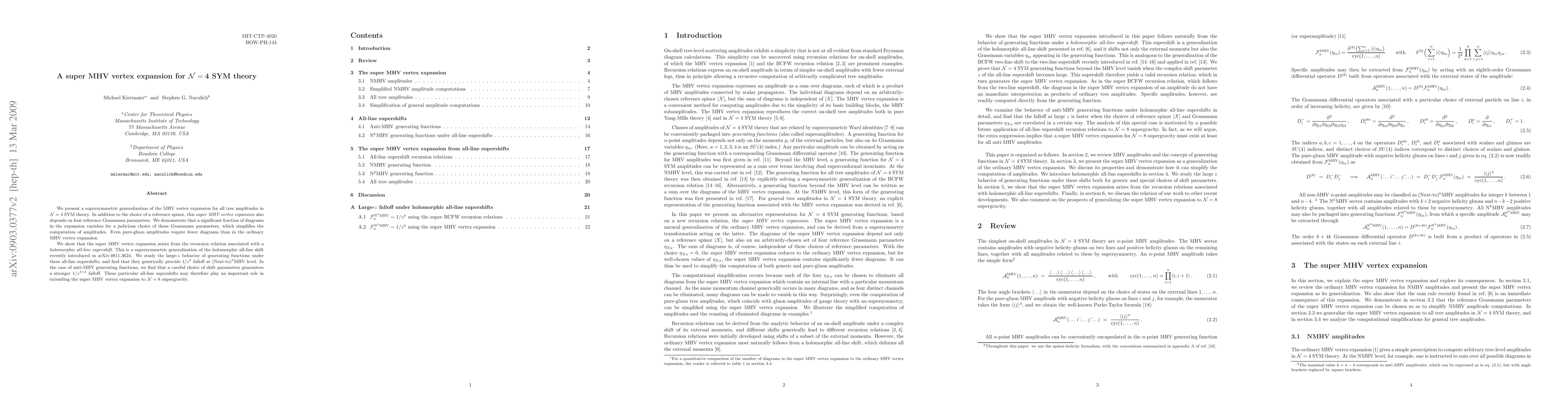We present a supersymmetric generalization of the MHV vertex expansion for all tree amplitudes in N=4 SYM theory. In addition to the choice of a reference spinor, this super MHV vertex expansion also depends on four reference Grassmann parameters. We demonstrate that a significant fraction of diagrams in the expansion vanishes for a judicious choice of these Grassmann parameters, which simplifies the computation of amplitudes. Even pure-gluon amplitudes require fewer diagrams than in the ordinary MHV vertex expansion. We show that the super MHV vertex expansion arises from the recursion relation associated with a holomorphic all-line supershift. This is a supersymmetric generalization of the holomorphic all-line shift recently introduced in arXiv:0811.3624. We study the large-z behavior of generating functions under these all-line supershifts, and find that they generically provide 1/z^k falloff at (Next-to)^k MHV level. In the case of anti-MHV generating functions, we find that a careful choice of shift parameters guarantees a stronger 1/z^(k+4) falloff. These particular all-line supershifts may therefore play an important role in extending the super MHV vertex expansion to N=8 supergravity.