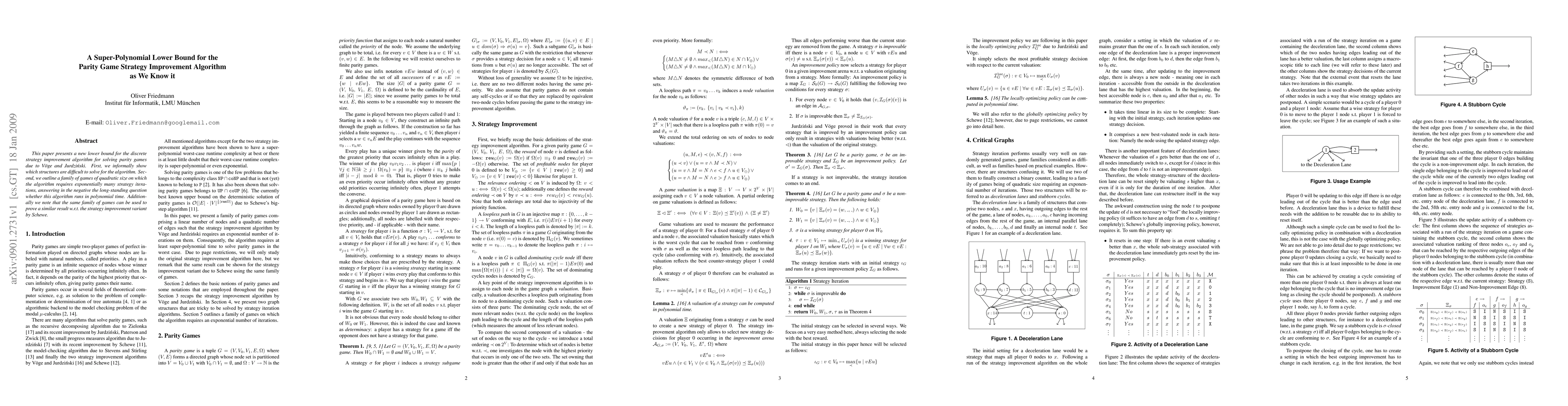 This paper establishes a super-polynomial lower bound for the strategy improvement algorithm used to solve parity games, demonstrating that it requires exponentially many iterations on certain quadratic-sized games. This result refutes the possibility of the algorithm running in polynomial time.