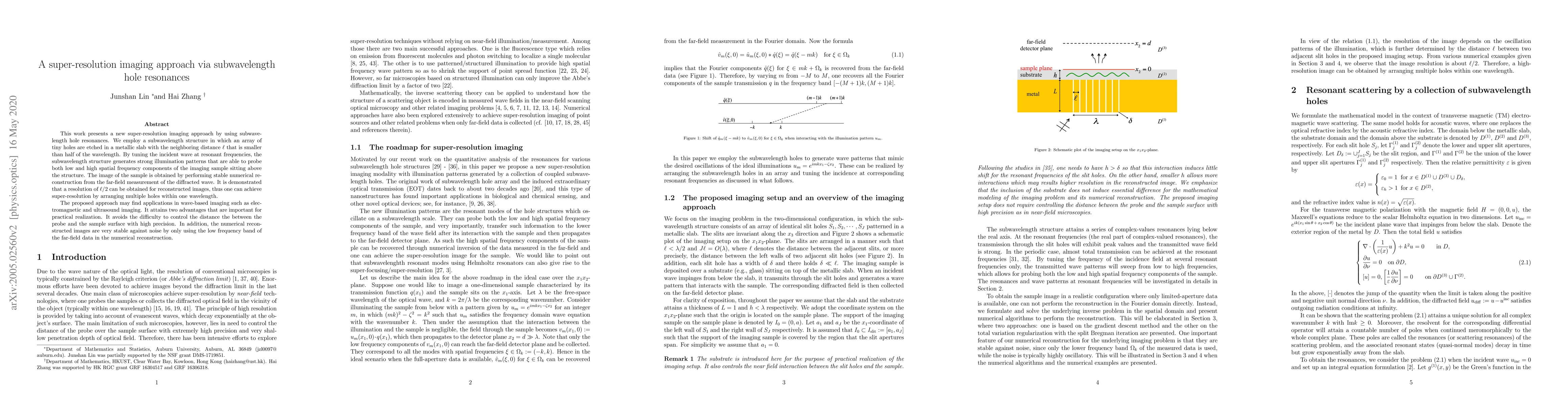 This work presents a new super-resolution imaging approach by using subwavelength hole resonances. We employ a subwavelength structure in which an array of tiny holes are etched in a metallic slab with the neighboring distance $\ell$ that is smaller than half of the wavelength. By tuning the incident wave at resonant frequencies, the subwavelength structure generates strong illumination patterns that are able to probe both low and high spatial frequency components of the imaging sample sitting above the structure. The image of the sample is obtained by performing stable numerical reconstruction from the far-field measurement of the diffracted wave. It is demonstrated that a resolution of $\ell/2$ can be obtained for reconstructed images, thus one can achieve super-resolution by arranging multiple holes within one wavelength. The proposed approach may find applications in wave-based imaging such as electromagnetic and ultrasound imaging. It attains two advantages that are important for practical realization. It avoids the difficulty to control the distance the between the probe and the sample surface with high precision. In addition, the numerical reconstructed images are very stable against noise by only using the low frequency band of the far-field data in the numerical reconstruction.