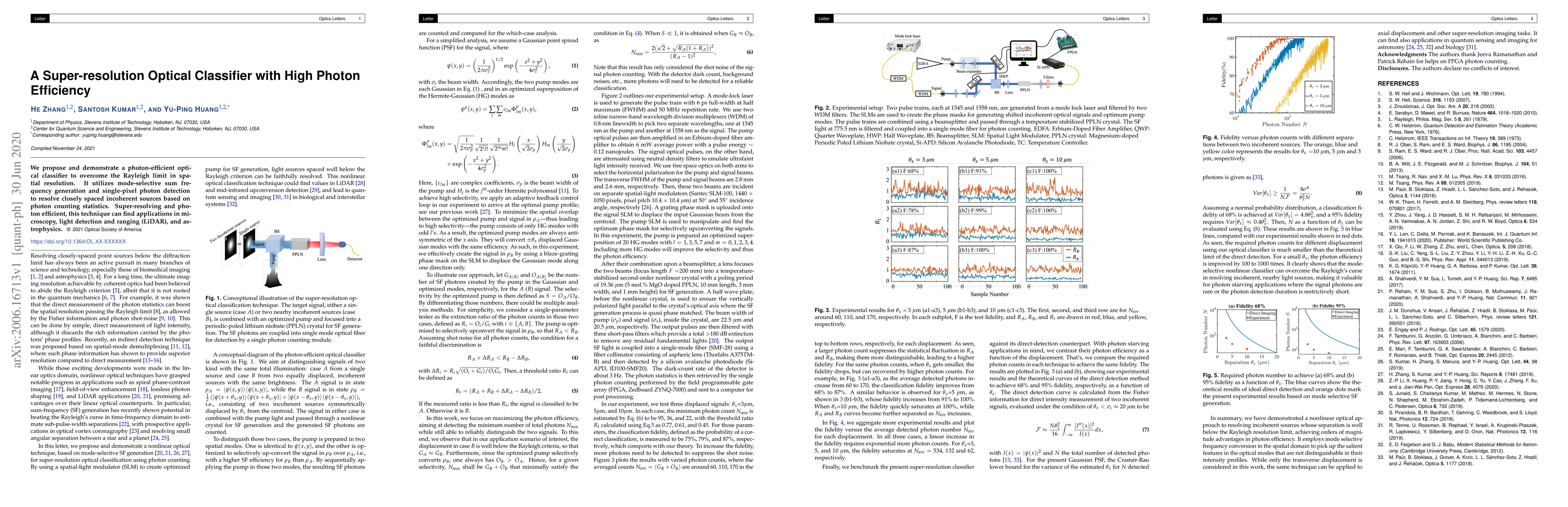 This paper presents a photon-efficient optical classifier that surpasses the Rayleigh limit in spatial resolution, employing mode-selective sum frequency generation and single-pixel photon detection. The technique, based on photon counting statistics, has potential applications in microscopy, LiDAR, and astrophysics.