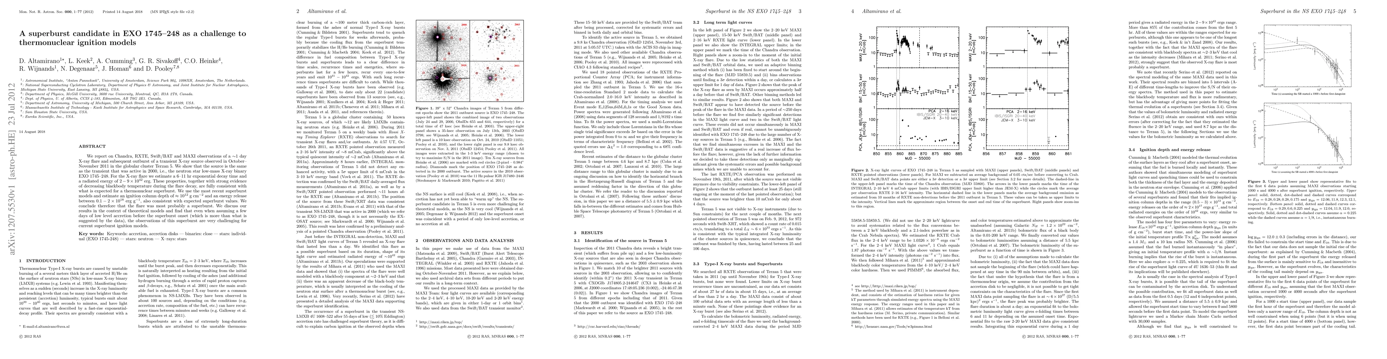 We report on Chandra, RXTE, Swift/BAT and MAXI observations of a ~1 day X-ray flare and subsequent outburst of a transient X-ray source observed in October-November 2011 in the globular cluster Terzan 5. We show that the source is the same as the transient that was active in 2000, i.e., the neutron star low-mass X-ray binary EXO 1745-248. For the X-ray flare we estimate a 6-11 hr exponential decay time and a radiated energy of 2-9 x 10^42 erg. These properties, together with strong evidence of decreasing blackbody temperature during the flare decay, are fully consistent with what is expected for a thermonuclear superburst. We use the most recent superburst models and estimate an ignition column depth of ~10^12 g cm^-2 and an energy release between 0.1-2 x 10^18 erg g^-1, also consistent with expected superburst values. We conclude therefore that the flare was most probably a superburst. We discuss our results in the context of theoretical models and find that even when assuming a few days of low level accretion before the superburst onset (which is more than what is suggested by the data), the observations of this superburst are very challenging for current superburst ignition models.