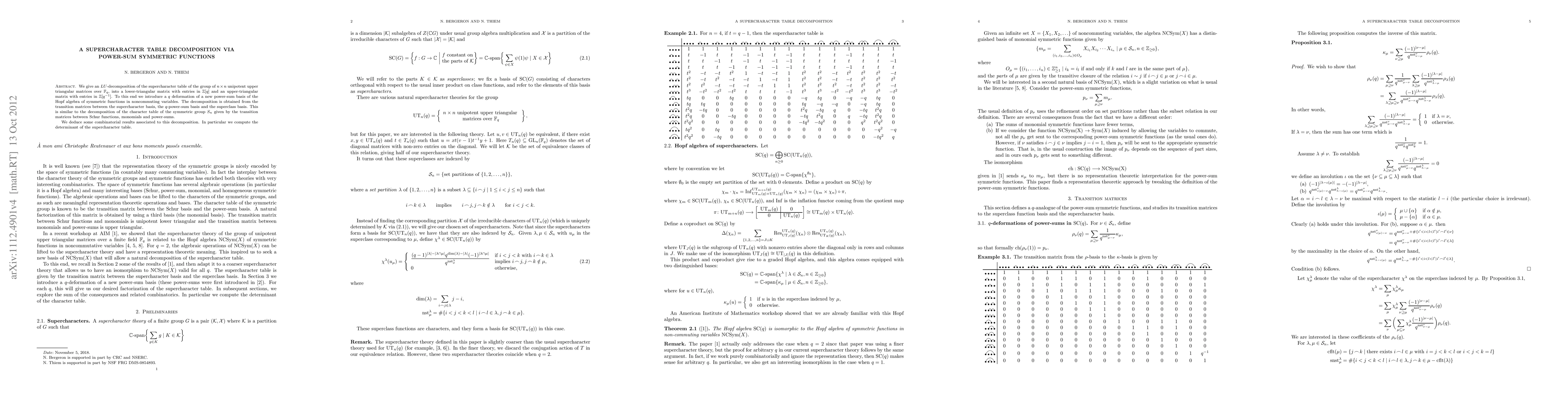 We give an $AB$-factorization of the supercharacter table of the group of $n\times n$ unipotent upper triangular matrices over $\FF_q$, where $A$ is a lower-triangular matrix with entries in $\ZZ[q]$ and $B$ is a unipotent upper-triangular matrix with entries in $\ZZ[q^{-1}]$. To this end we introduce a $q$ deformation of a new power-sum basis of the Hopf algebra of symmetric functions in noncommutative variables. The factorization is obtain from the transition matrices between the supercharacter basis, the $q$-power-sum basis and the superclass basis. This is similar to the decomposition of the character table of the symmetric group $S_n$ given by the transition matrices between Schur functions, monomials and power-sums. We deduce some combinatorial results associated to this decomposition. In particular we compute the determinant of the supercharacter table.