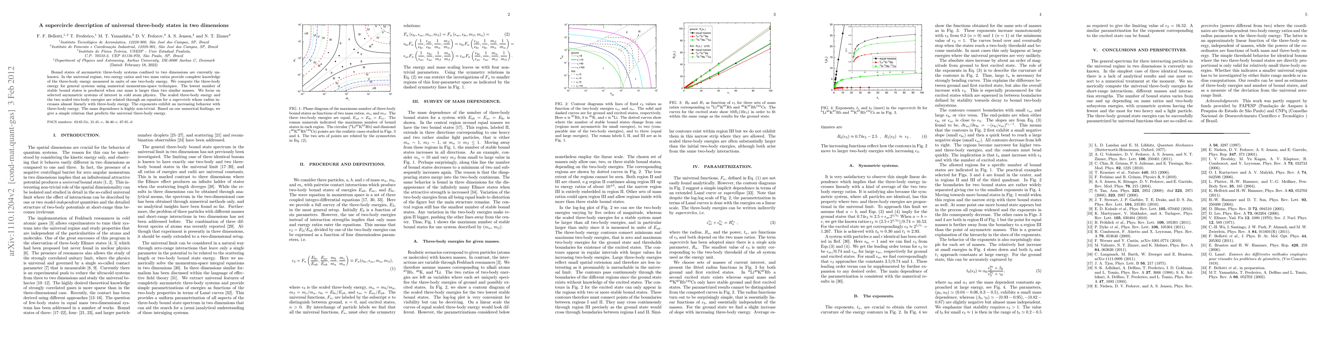 We consider bound states of asymmetric three-body systems confined to two dimensions. In the universal regime, two energy ratios and two mass ratios provide complete knowledge of the three-body energy measured in units of one two-body energy. The lowest number of stable bound states is produced when one mass is larger than two similar masses. We focus on selected asymmetric systems of interest in cold atom physics. The scaled three-body energy and the two scaled two-body energies are related through an equation for a supercircle whose radius increases almost linearly with three-body energy. The exponents exhibit an increasing behavior with three-body energy. The mass dependence is highly non-trivial. We give a simple relation that predicts the universal three-body energy.