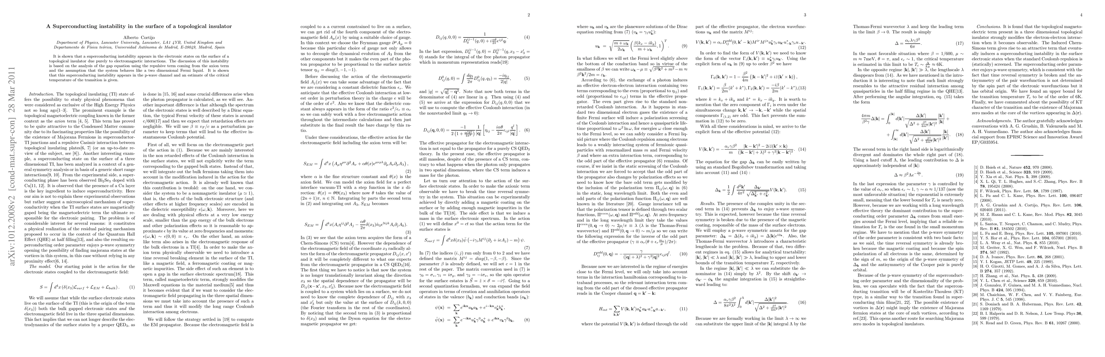 Researchers discover a superconducting instability in topological insulators due to electromagnetic interactions, which is similar to the case in pure Quantum Electrodynamics of 3 dimensions (QED$_{3}$). A critical temperature expression for the transition is provided.