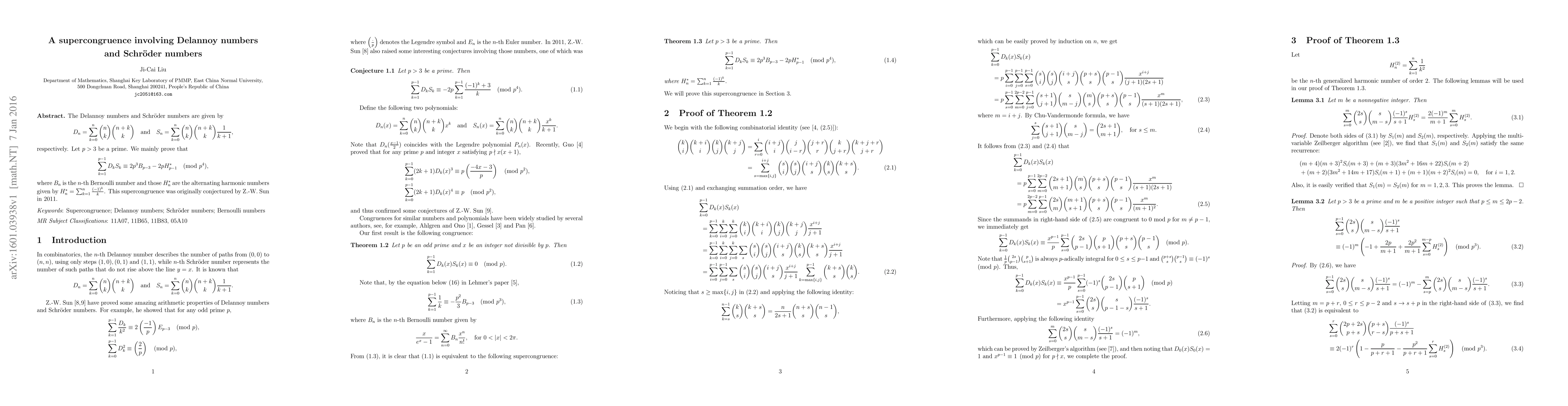 This paper proves a supercongruence involving Delannoy and Schröder numbers modulo \(p^4\) for a prime \(p > 3\), confirming a conjecture by Z.-W. Sun. The result connects these combinatorial numbers to Bernoulli numbers and alternating harmonic numbers.