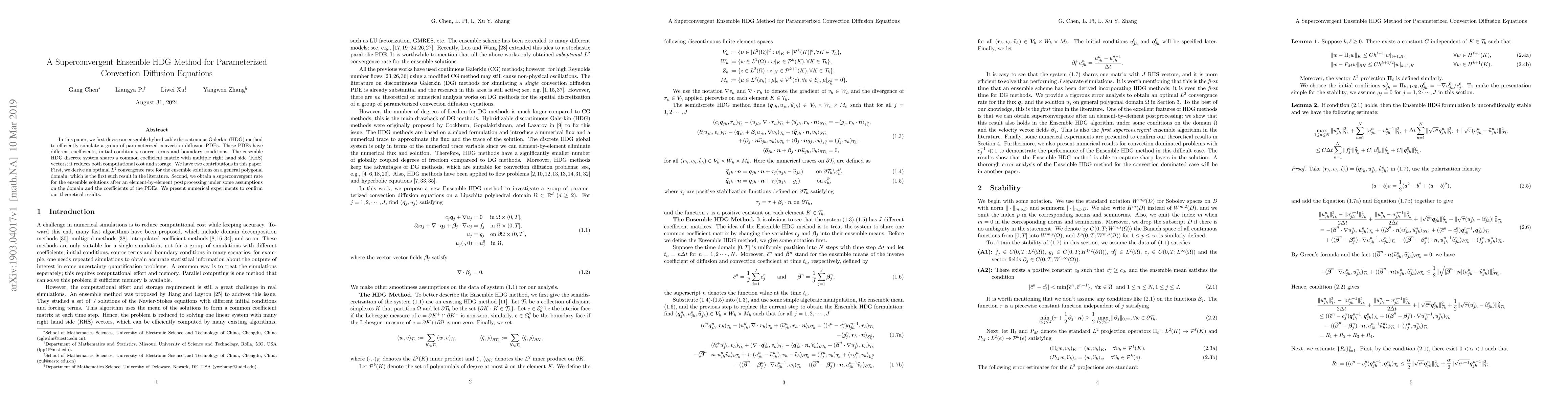 In this paper, we first devise an ensemble hybridizable discontinuous Galerkin (HDG) method to efficiently simulate a group of parameterized convection diffusion PDEs. These PDEs have different coefficients, initial conditions, source terms and boundary conditions. The ensemble HDG discrete system shares a common coefficient matrix with multiple right hand side (RHS) vectors; it reduces both computational cost and storage. We have two contributions in this paper. First, we derive an optimal $L^2$ convergence rate for the ensemble solutions on a general polygonal domain, which is the first such result in the literature. Second, we obtain a superconvergent rate for the ensemble solutions after an element-by-element postprocessing under some assumptions on the domain and the coefficients of the PDEs. We present numerical experiments to confirm our theoretical results.