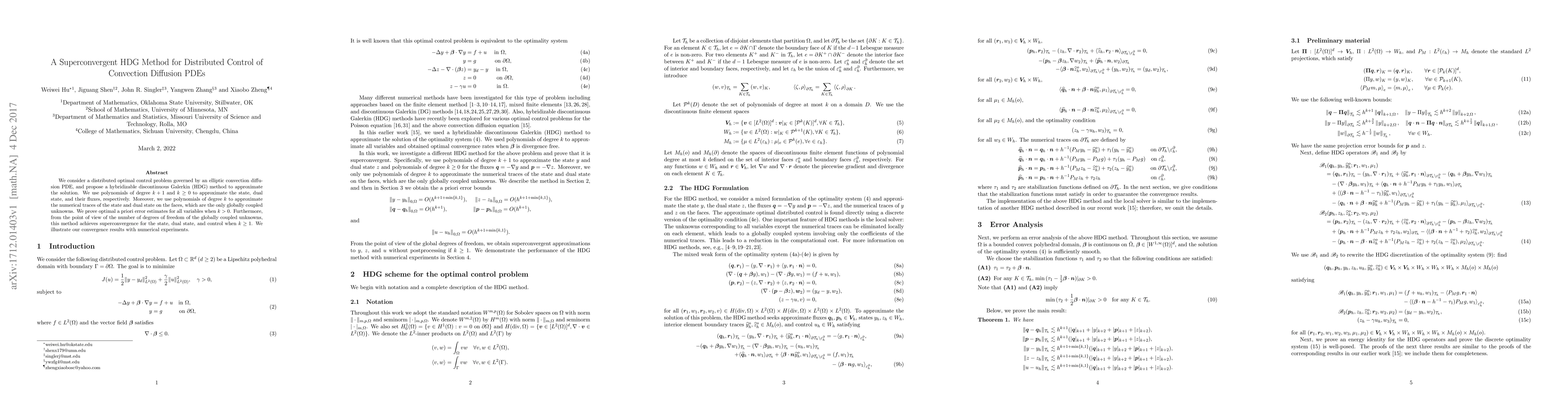 This paper proposes a hybridizable discontinuous Galerkin (HDG) method for solving distributed optimal control problems governed by elliptic convection-diffusion PDEs, achieving superconvergence for the state, dual state, and control when using polynomials of degree $k \geq 1$. Numerical experiments validate the theoretical convergence results.
