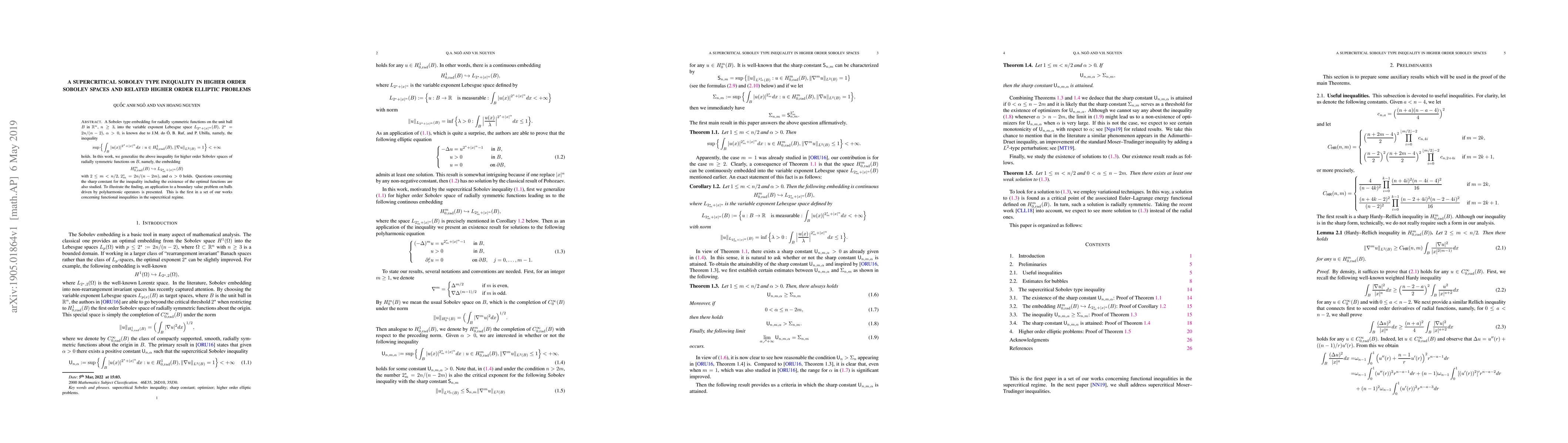 A Sobolev type embedding for radially symmetric functions on the unit ball $B$ in $\mathbb R^n$, $n\geq 3$, into the variable exponent Lebesgue space $L_{2^\star + |x|^\alpha} (B)$, $2^\star = 2n/(n-2)$, $\alpha>0$, is known due to J.M. do \'O, B. Ruf, and P. Ubilla, namely, the inequality \[ \sup\Big\{\int_B |u(x)|^{2^\star+|x|^\alpha} dx : u\in H^1_{0,{\rm rad}}(B), \|\nabla u\|_{L^2(B)} =1\Big\} < +\infty \] holds. In this work, we generalize the above inequality for higher order Sobolev spaces of radially symmetric functions on $B$, namely, the embedding \[ H^m_{0,{\rm rad}}(B) \hookrightarrow L_{2_m^\star + |x|^\alpha} (B) \] with $2\leq m < n/2$, $2_m^* = 2n/(n-2m)$, and $\alpha>0$ holds. Questions concerning the sharp constant for the inequality including the existence of the optimal functions are also studied. To illustrate the finding, an application to a boundary value problem on balls driven by polyharmonic operators is presented. This is the first in a set of our works concerning functional inequalities in the supercritical regime.