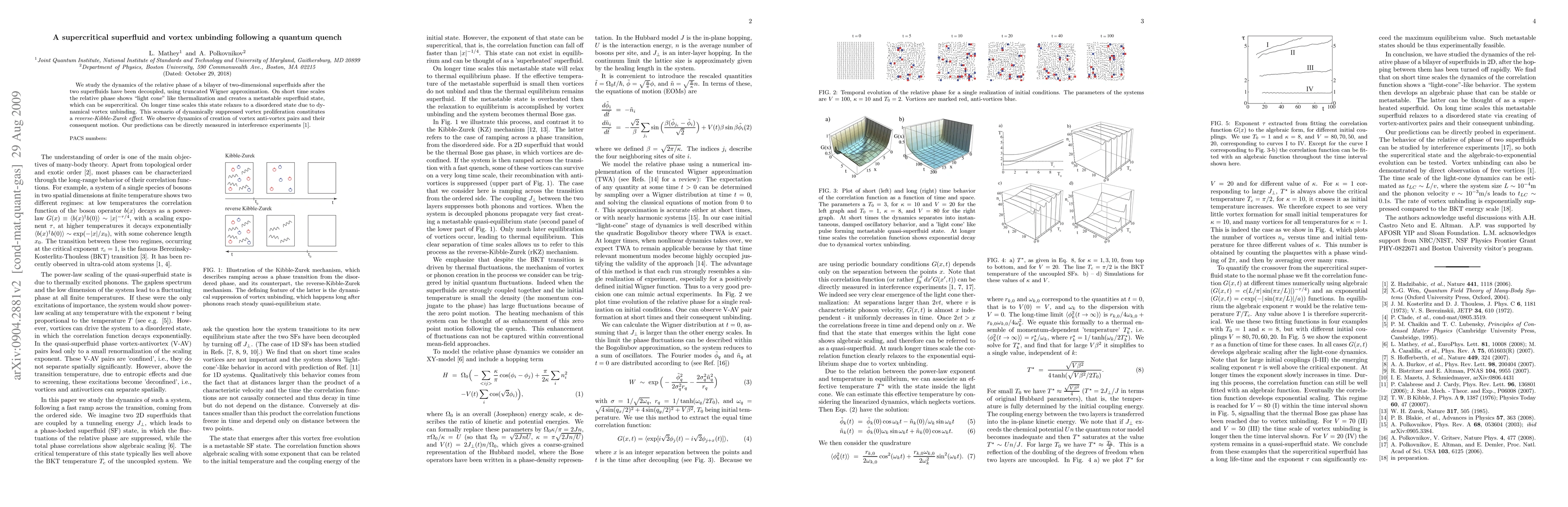 We study the dynamics of the relative phase of a bilayer of two-dimensional superfluids after the two superfluids have been decoupled, using truncated Wigner approximation. On short time scales the relative phase shows "light cone" like thermalization and creates a metastable superfluid state, which can be supercritical. On longer time scales this state relaxes to a disordered state due to dynamical vortex unbinding. This scenario of dynamically suppressed vortex proliferation constitutes a {\it reverse-Kibble-Zurek effect}. We observe dynamics of creation of vortex anti-vortex pairs and their consequent motion. Our predictions can be directly measured in interference experiments, see Ref 1.