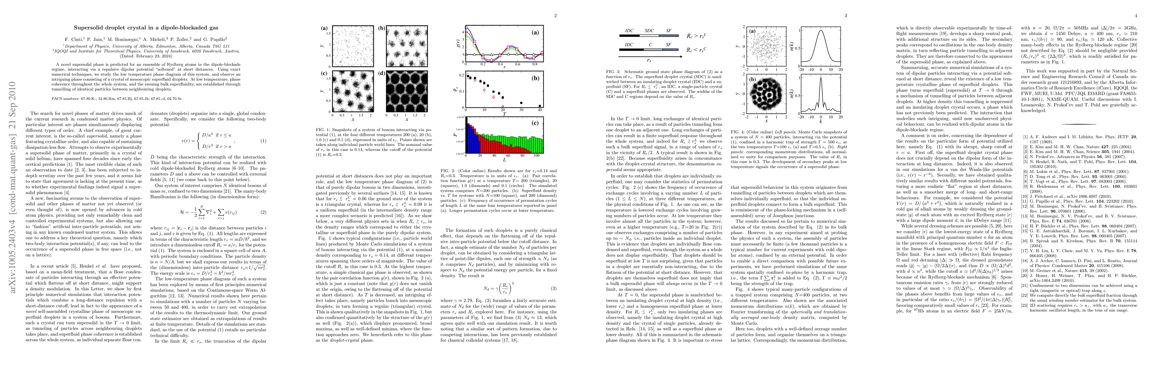 A novel supersolid phase is predicted for an ensemble of Rydberg atoms in the dipole-blockade regime, interacting via a repulsive dipolar potential "softened" at short distances. Using exact numerical techniques, we study the low temperature phase diagram of this system, and observe an intriguing phase consisting of a crystal of mesoscopic superfluid droplets. At low temperature, phase coherence throughout the whole system, and the ensuing bulk superfluidity, are established through tunnelling of identical particles between neighbouring droplets.