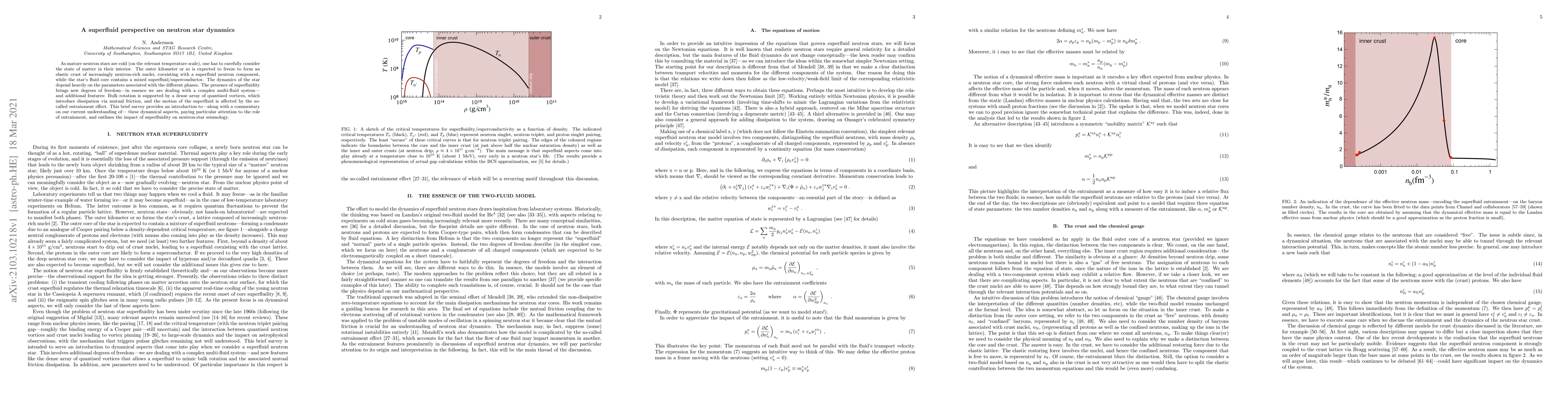 As mature neutron stars are cold (on the relevant temperature scale), one has to carefully consider the state of matter in their interior. The outer kilometer or so is expected to freeze to form an elastic crust of increasingly neutron-rich nuclei, coexisting with a superfluid neutron component, while the star's fluid core contains a mixed superfluid/superconductor. The dynamics of the star depend heavily on the parameters associated with the different phases. The presence of superfluidity brings new degrees of freedom -- in essence we are dealing with a complex multi-fluid system -- and additional features: Bulk rotation is supported by a dense array of quantised vortices, which introduce dissipation via mutual friction, and the motion of the superfluid is affected by the so-called entrainment effect. This brief survey provides an introduction to -- along with a commentary on our current understanding of -- these dynamical aspects, paying particular attention to the role of entrainment, and outlines the impact of superfluidity on neutron-star seismology.