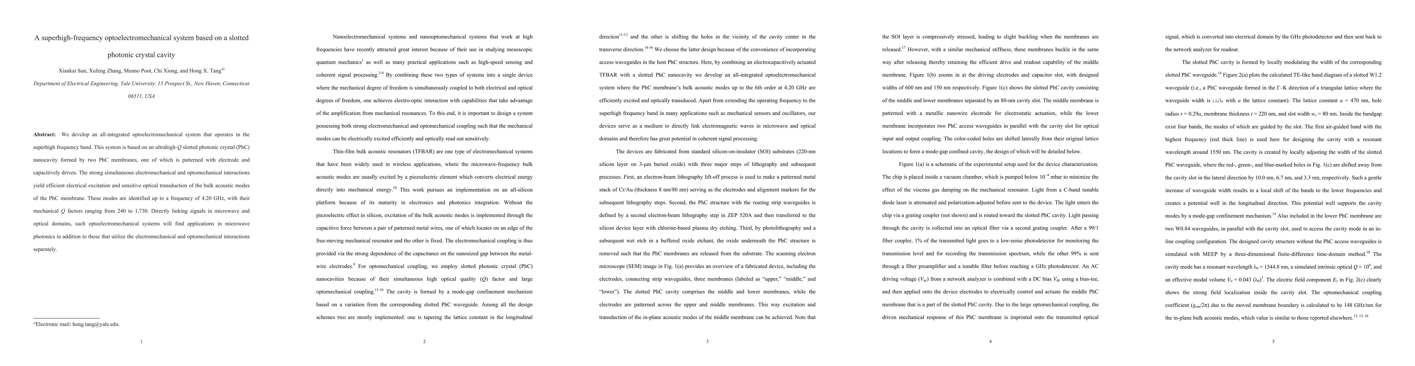 This paper presents an integrated optoelectromechanical system operating in the superhigh-frequency band, utilizing a slotted photonic crystal cavity. The system demonstrates efficient electrical excitation and optical transduction of bulk acoustic modes up to 4.20 GHz, with mechanical Q factors ranging from 240 to 1,730, promising applications in microwave photonics.