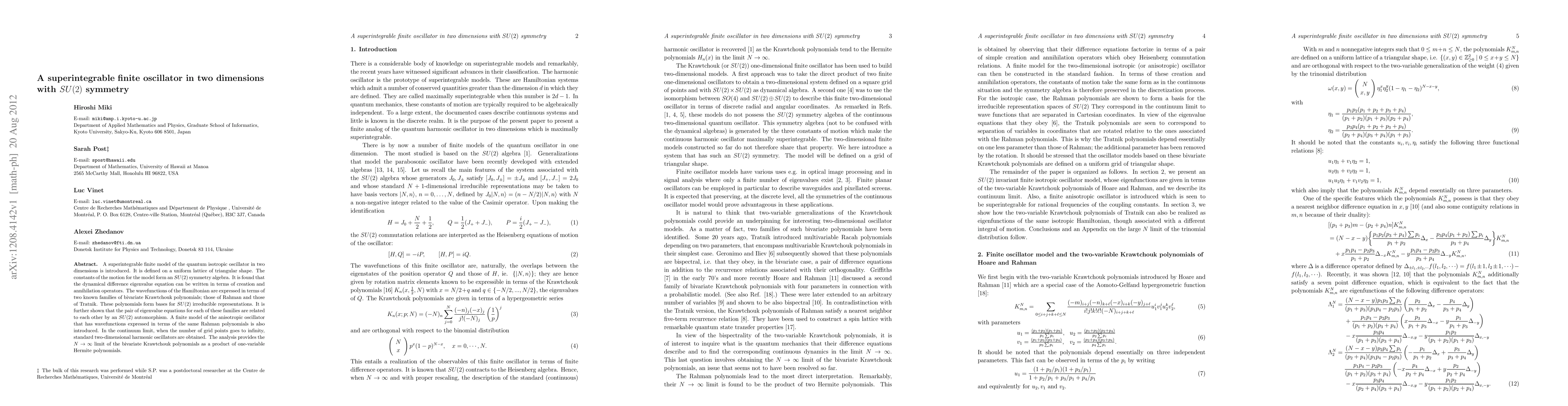 A superintegrable finite model of the quantum isotropic oscillator in two dimensions is introduced. It is defined on a uniform lattice of triangular shape. The constants of the motion for the model form an SU(2) symmetry algebra. It is found that the dynamical difference eigenvalue equation can be written in terms of creation and annihilation operators. The wavefunctions of the Hamiltonian are expressed in terms of two known families of bivariate Krawtchouk polynomials; those of Rahman and those of Tratnik. These polynomials form bases for SU(2) irreducible representations. It is further shown that the pair of eigenvalue equations for each of these families are related to each other by an SU(2) automorphism. A finite model of the anisotropic oscillator that has wavefunctions expressed in terms of the same Rahman polynomials is also introduced. In the continuum limit, when the number of grid points goes to infinity, standard two-dimensional harmonic oscillators are obtained. The analysis provides the $N\rightarrow \infty$ limit of the bivariate Krawtchouk polynomials as a product of one-variable Hermite polynomials.