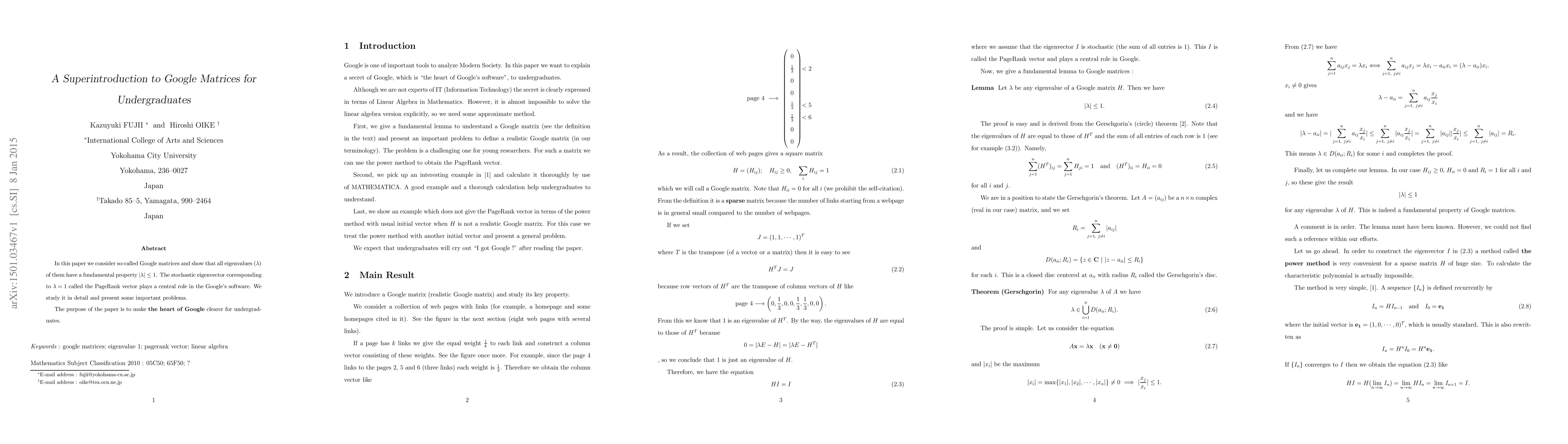 In this paper we consider so-called Google matrices and show that all eigenvalues ($\lambda$) of them have a fundamental property $|\lambda|\leq 1$. The stochastic eigenvector corresponding to $\lambda=1$ called the PageRank vector plays a central role in the Google's software. We study it in detail and present some important problems. The purpose of the paper is to make {\bf the heart of Google} clearer for undergraduates.