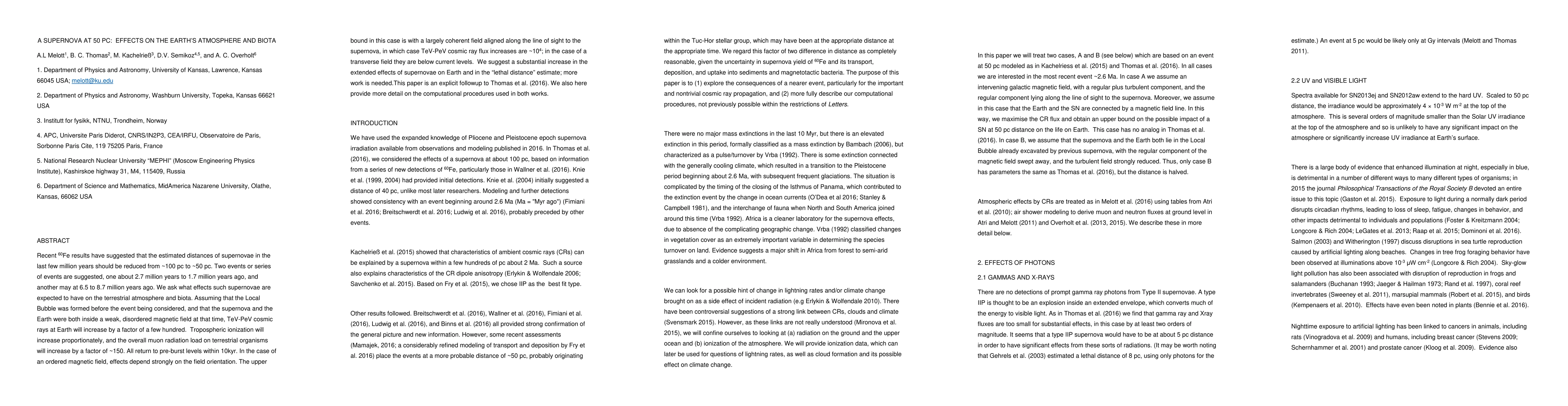 Recent 60Fe results have suggested that the estimated distances of supernovae in the last few million years should be reduced from 100 pc to 50 pc. Two events or series of events are suggested, one about 2.7 million years to 1.7 million years ago, and another may at 6.5 to 8.7 million years ago. We ask what effects such supernovae are expected to have on the terrestrial atmosphere and biota. Assuming that the Local Bubble was formed before the event being considered, and that the supernova and the Earth were both inside a weak, disordered magnetic field at that time, TeV-PeV cosmic rays at Earth will increase by a factor of a few hundred. Tropospheric ionization will increase proportionately, and the overall muon radiation load on terrestrial organisms will increase by a factor of 150. All return to pre-burst levels within 10kyr. In the case of an ordered magnetic field, effects depend strongly on the field orientation. The upper bound in this case is with a largely coherent field aligned along the line of sight to the supernova, in which case TeV-PeV cosmic ray flux increases are 10^4; in the case of a transverse field they are below current levels. We suggest a substantial increase in the extended effects of supernovae on Earth and in the lethal distance estimate; more work is needed.This paper is an explicit followup to Thomas et al. (2016). We also here provide more detail on the computational procedures used in both works.