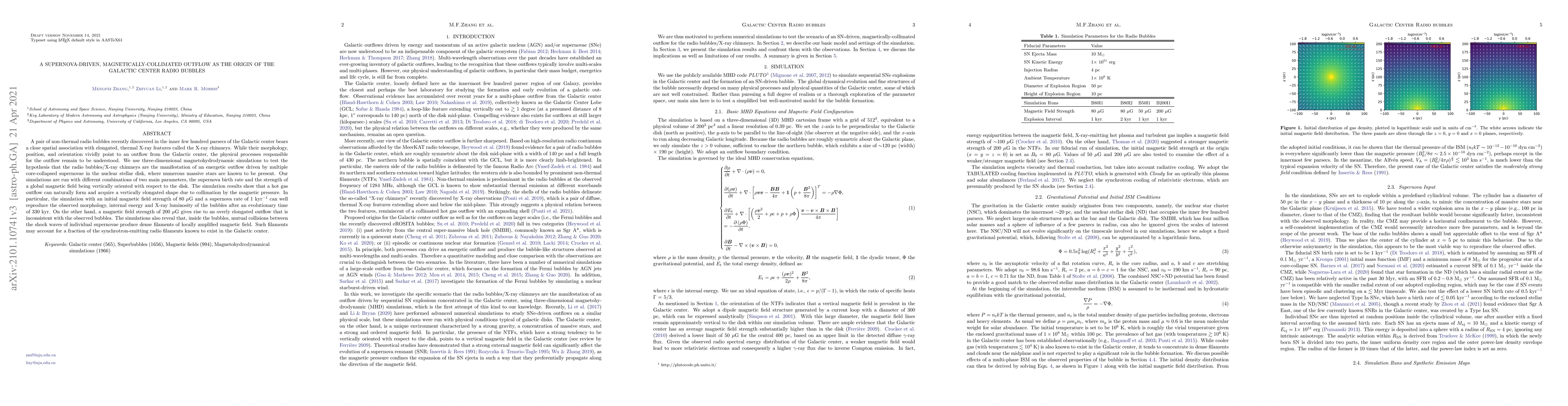 This study uses 3D magnetohydrodynamic simulations to show that supernova explosions in the Galactic center, combined with magnetic fields, can create the observed radio bubbles and X-ray features by driving a collimated outflow. The findings suggest supernova-driven, magnetically shaped outflows are key to understanding these energetic structures.