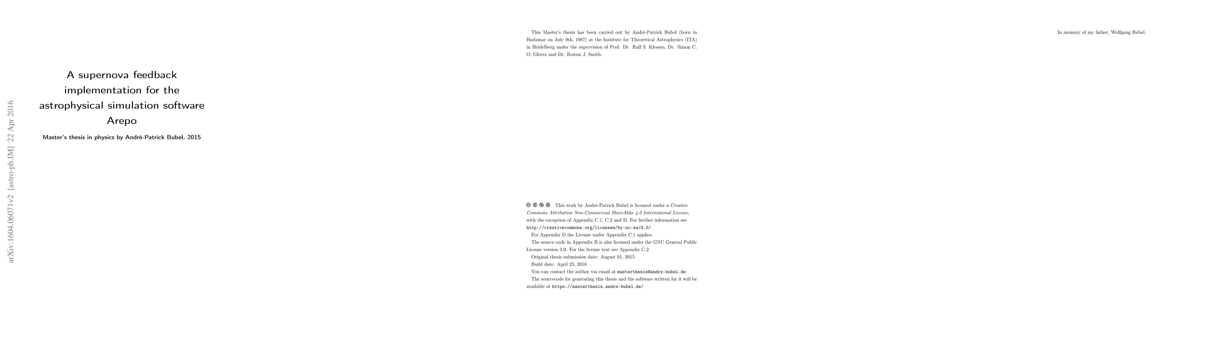 This research paper implements a supernova feedback model in the astrophysical simulation software Arepo to study galactic structure development. It successfully simulates supernovae explosions and their effects on gas turbulence and star formation.