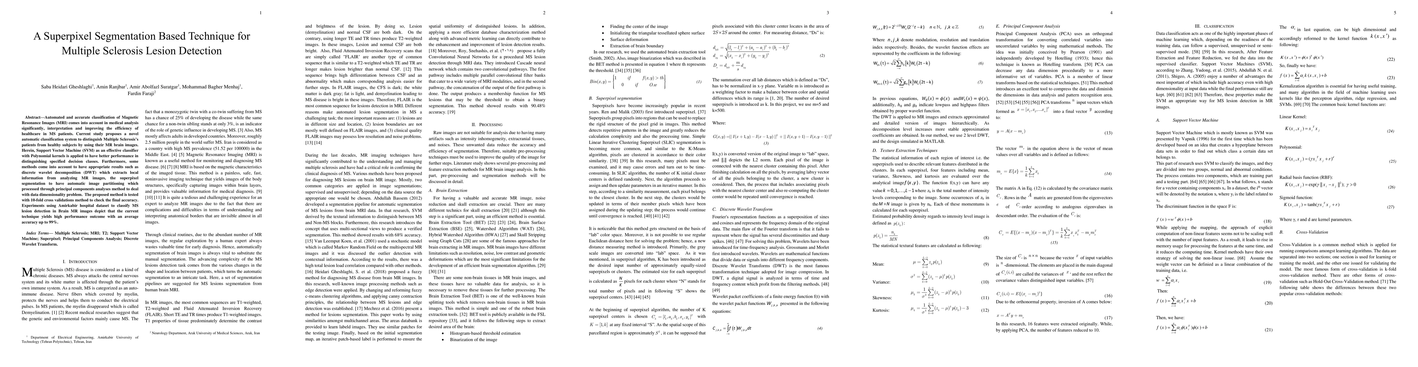 A Superpixel Segmentation Based Technique for Multiple Sclerosis Lesion Detection