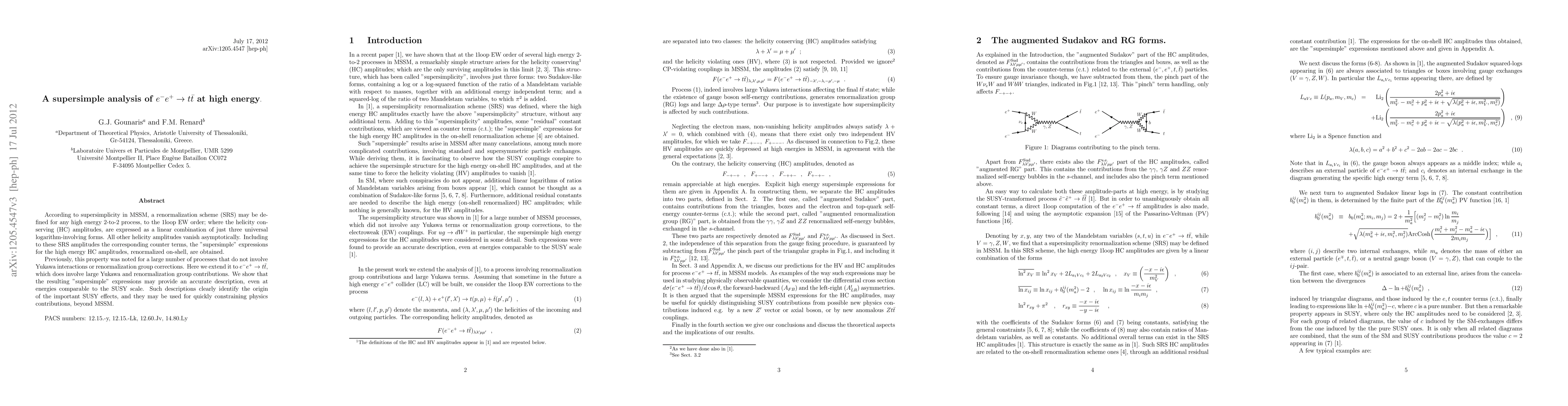 According to supersimplicity in MSSM, a renormalization scheme (SRS) may be defined for any high energy 2-to-2 process, to the 1loop EW order; where the helicity conserving (HC) amplitudes, are expressed as a linear combination of just three universal logarithm-involving forms. All other helicity amplitudes vanish asymptotically. Including to these SRS amplitudes the corresponding counter terms, the "supersimple" expressions for the high energy HC amplitudes, renormalized on-shell, are obtained. Previously, this property was noted for a large number of processes that do not involve Yukawa interactions or renormalization group corrections. Here we extend it to $e^-e^+\to t \bar t$, which does involve large Yukawa and renormalization group contributions. We show that the resulting "supersimple" expressions may provide an accurate description, even at energies comparable to the SUSY scale. Such descriptions clearly identify the origin of the important SUSY effects, and they may be used for quickly constraining physics contributions, beyond MSSM.