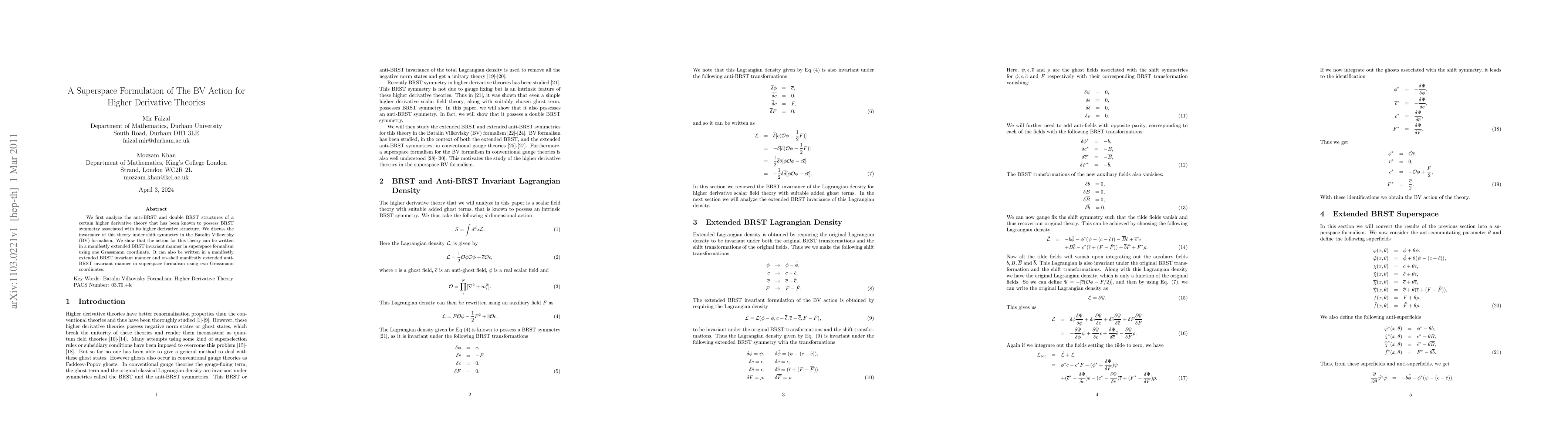 This paper explores the anti-BRST and double BRST structures of a higher derivative theory, demonstrating its invariance under shift symmetry in the BV formalism. The authors present the BV action in superspace formalism, showing it to be manifestly extended BRST invariant using one Grassmann coordinate, and on-shell extended anti-BRST invariant with two Grassmann coordinates.