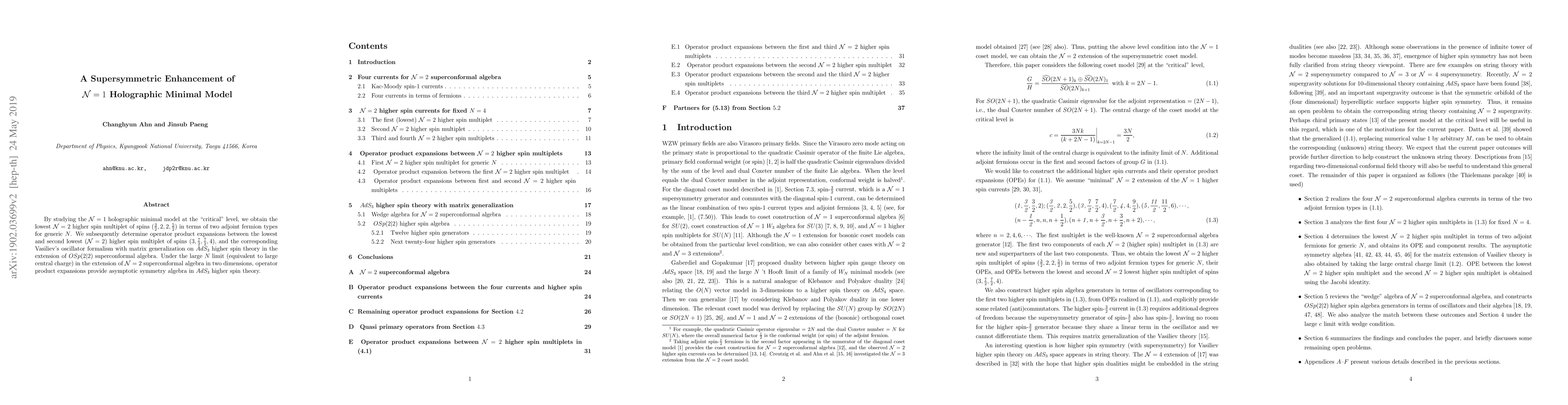 This paper explores the ${\cal N}=1$ holographic minimal model at the critical level to derive the lowest ${\cal N}=2$ higher spin multiplet and examines operator product expansions between these multiplets, linking them to Vasiliev's oscillator formalism in the context of $AdS_3$ higher spin theory. The large $N$ limit reveals the asymptotic symmetry algebra in this framework.