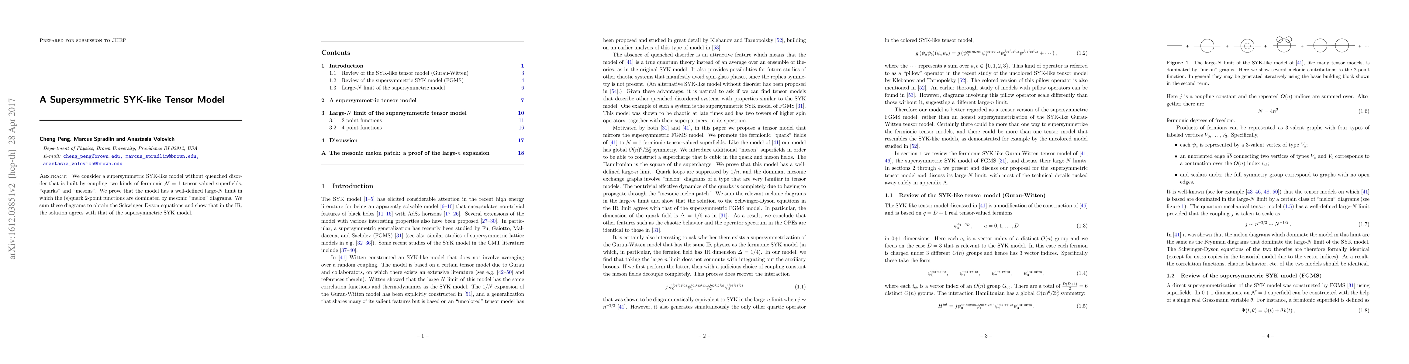 We consider a supersymmetric SYK-like model without quenched disorder that is built by coupling two kinds of fermionic N=1 tensor-valued superfields, "quarks" and "mesons". We prove that the model has a well-defined large-N limit in which the (s)quark 2-point functions are dominated by mesonic "melon" diagrams. We sum these diagrams to obtain the Schwinger-Dyson equations and show that in the IR, the solution agrees with that of the supersymmetric SYK model.
