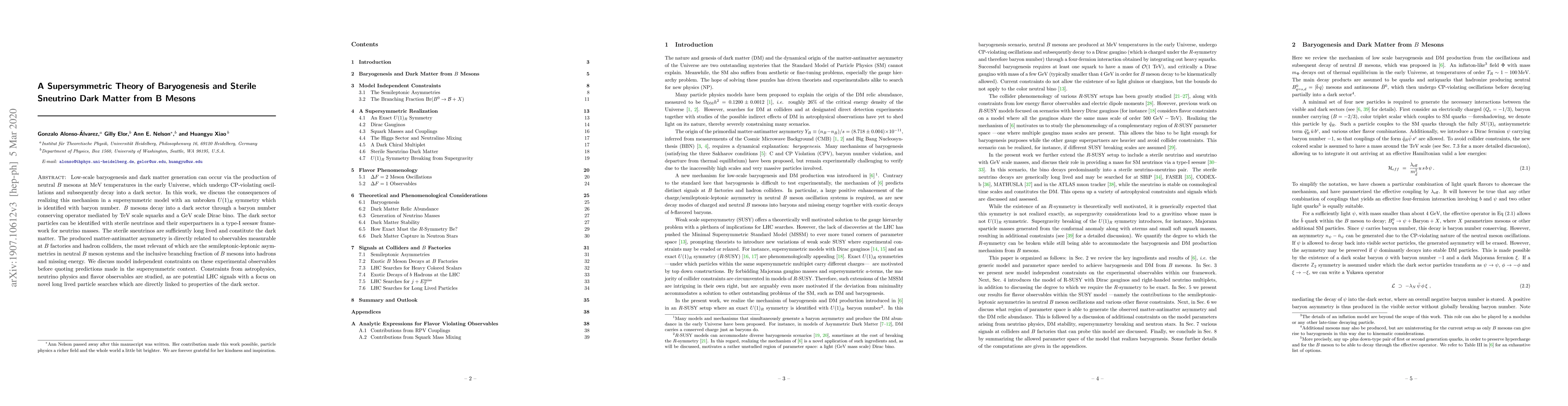 Low-scale baryogenesis and dark matter generation can occur via the production of neutral $B$ mesons at MeV temperatures in the early Universe, which undergo CP-violating oscillations and subsequently decay into a dark sector. In this work, we discuss the consequences of realizing this mechanism in a supersymmetric model with an unbroken $U(1)_R$ symmetry which is identified with baryon number. $B$ mesons decay into a dark sector through a baryon number conserving operator mediated by TeV scale squarks and a GeV scale Dirac bino. The dark sector particles can be identified with sterile neutrinos and their superpartners in a type-I seesaw framework for neutrino masses. The sterile sneutrinos are sufficiently long lived and constitute the dark matter. The produced matter-antimatter asymmetry is directly related to observables measurable at $B$ factories and hadron colliders, the most relevant of which are the semileptonic-leptonic asymmetries in neutral $B$ meson systems and the inclusive branching fraction of $B$ mesons into hadrons and missing energy. We discuss model independent constraints on these experimental observables before quoting predictions made in the supersymmetric context. Constraints from astrophysics, neutrino physics and flavor observables are studied, as are potential LHC signals with a focus on novel long lived particle searches which are directly linked to properties of the dark sector.