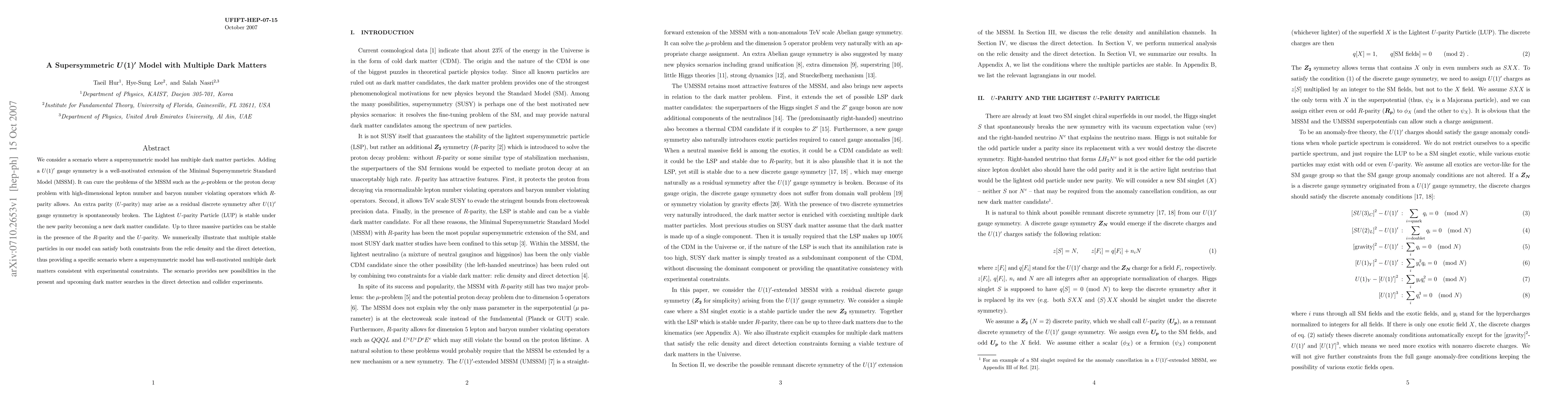 We consider a scenario where a supersymmetric model has multiple dark matter particles. Adding a U(1)' gauge symmetry is a well-motivated extension of the Minimal Supersymmetric Standard Model (MSSM). It can cure the problems of the MSSM such as the mu-problem or the proton decay problem with high-dimensional lepton number and baryon number violating operators which R-parity allows. An extra parity (U-parity) may arise as a residual discrete symmetry after U(1)' gauge symmetry is spontaneously broken. The Lightest U-parity Particle (LUP) is stable under the new parity becoming a new dark matter candidate. Up to three massive particles can be stable in the presence of the R-parity and the U-parity. We numerically illustrate that multiple stable particles in our model can satisfy both constraints from the relic density and the direct detection, thus providing a specific scenario where a supersymmetric model has well-motivated multiple dark matters consistent with experimental constraints. The scenario provides new possibilities in the present and upcoming dark matter searches in the direct detection and collider experiments.