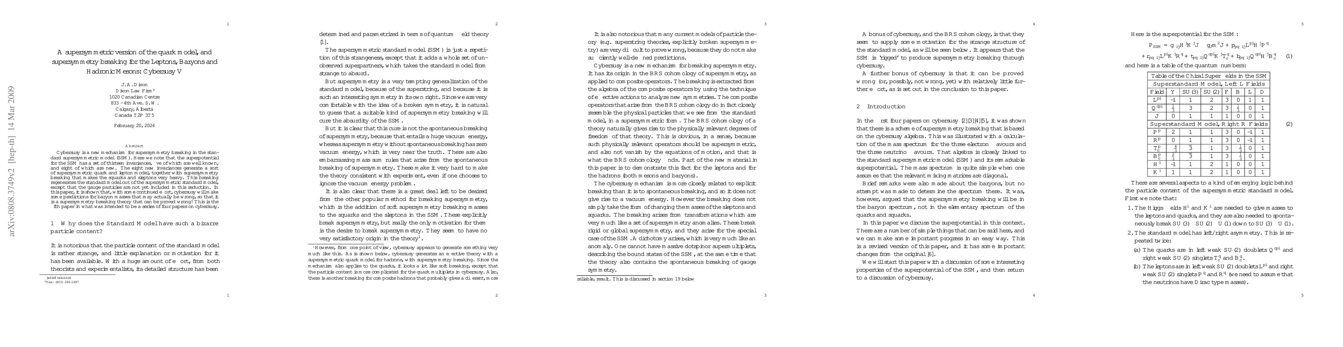 Cybersusy is a new mechanism for supersymmetry breaking in the standard supersymmetric model (SSM). Here we note that the superpotential for the SSM has a set of thirteen invariances, five of which are well known, and eight of which are new. The eight new invariances generate a sort of supersymmetric quark and lepton model, together with supersymmetry breaking that makes the squarks and sleptons very heavy. This breaking regenerates the standard model out of the supersymmetric standard model, except that the gauge particles are not yet included in this reduction. In this paper, it is shown that, with some continued effort, cybersusy will make some predictions for hadron masses that may actually be wrong, so that it is a supersymmetry breaking theory that can be proved wrong! This is the fifth paper in what was intended to be a series of four papers on cybersusy.