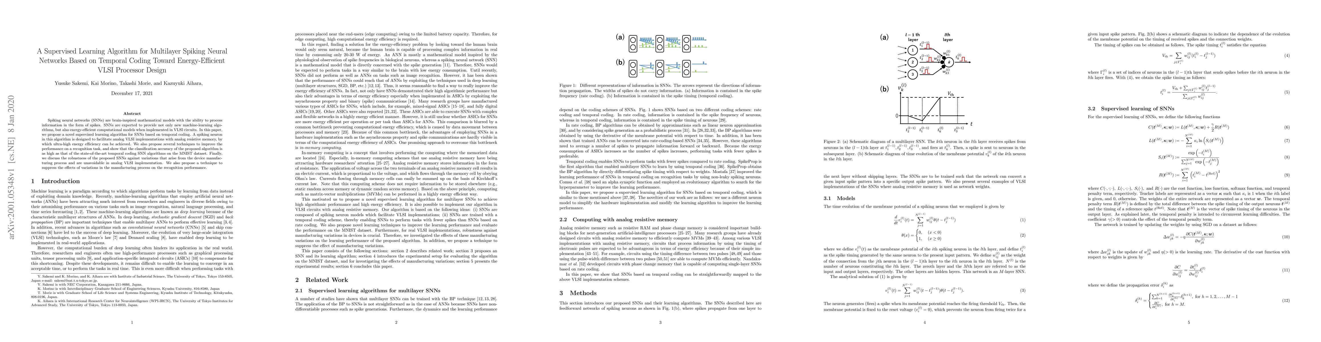 This paper proposes a supervised learning algorithm for multilayer spiking neural networks (SNNs) based on temporal coding, aiming for energy-efficient VLSI processor design. The algorithm achieves high classification accuracy on the MNIST dataset and includes techniques to mitigate the effects of manufacturing variations in analog VLSI implementations.