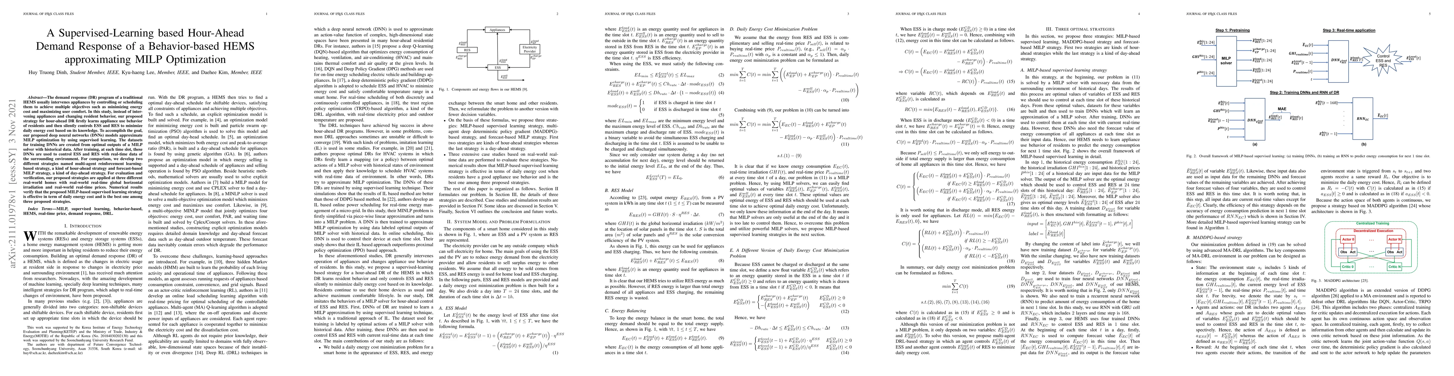 The demand response (DR) program of a traditional HEMS usually intervenes appliances by controlling or scheduling them to achieve multiple objectives such as minimizing energy cost and maximizing user comfort. In this study, instead of intervening appliances and changing resident behavior, our proposed strategy for hour-ahead DR firstly learns appliance use behavior of residents and then silently controls ESS and RES to minimize daily energy cost based on its knowledge. To accomplish the goal, our proposed deep neural networks (DNNs) models approximate MILP optimization by using supervised learning. The datasets for training DNNs are created from optimal outputs of a MILP solver with historical data. After training, at each time slot, these DNNs are used to control ESS and RES with real-time data of the surrounding environment. For comparison, we develop two different strategies named multi-agent reinforcement learning-based strategy, a kind of hour-ahead strategy and forecast-based MILP strategy, a kind of day-ahead strategy. For evaluation and verification, our proposed strategies are applied at three different real-world homes with real-world real-time global horizontal irradiation and real-world real-time prices. Numerical results verify that the proposed MILP-based supervised learning strategy is effective in term of daily energy cost and is the best one among three proposed strategies