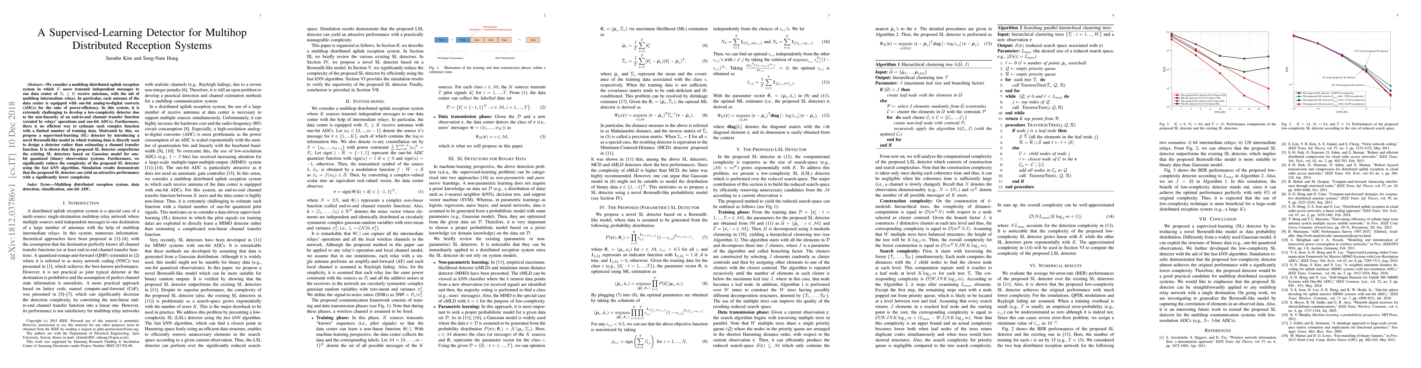 We consider a multihop distributed uplink reception system in which $K$ users transmit independent messages to one data center of $N_{\rm r} \geq K$ receive antennas, with the aid of multihop intermediate relays. In particular, each antenna of the data center is equipped with one-bit analog-to-digital converts (ADCs) for the sake of power-efficiency. In this system, it is extremely challenging to develop a low-complexity detector due to the non-linearity of an end-to-end channel transfer function (created by relays' operations and one-bit ADCs). Furthermore, there is no efficient way to estimate such complex function with a limited number of training data. Motivated by this, we propose a supervised-learning (SL) detector by introducing a novel Bernoulli-like model in which training data is directly used to design a detector rather than estimating a channel transfer function. It is shown that the proposed SL detector outperforms the existing SL detectors based on Gaussian model for one-bit quantized (binary observation) systems. Furthermore, we significantly reduce the complexity of the proposed SL detector using the fast kNN algorithm. Simulation results demonstrate that the proposed SL detector can yield an attractive performance with a significantly lower complexity.