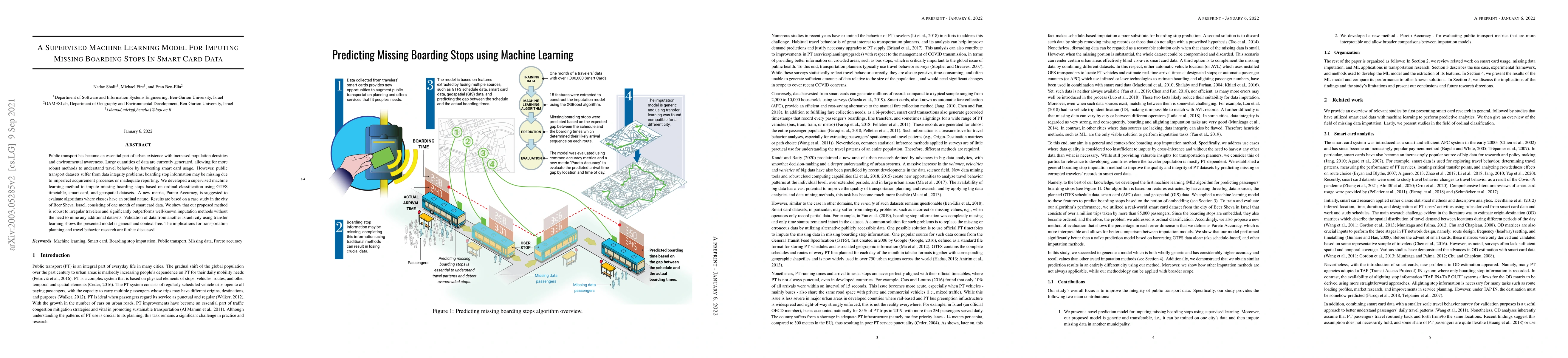 Public transport has become an essential part of urban existence with increased population densities and environmental awareness. Large quantities of data are currently generated, allowing for more robust methods to understand travel behavior by harvesting smart card usage. However, public transport datasets suffer from data integrity problems; boarding stop information may be missing due to imperfect acquirement processes or inadequate reporting. We developed a supervised machine learning method to impute missing boarding stops based on ordinal classification using GTFS timetable, smart card, and geospatial datasets. A new metric, Pareto Accuracy, is suggested to evaluate algorithms where classes have an ordinal nature. Results are based on a case study in the city of Beer Sheva, Israel, consisting of one month of smart card data. We show that our proposed method is robust to irregular travelers and significantly outperforms well-known imputation methods without the need to mine any additional datasets. Validation of data from another Israeli city using transfer learning shows the presented model is general and context-free. The implications for transportation planning and travel behavior research are further discussed.