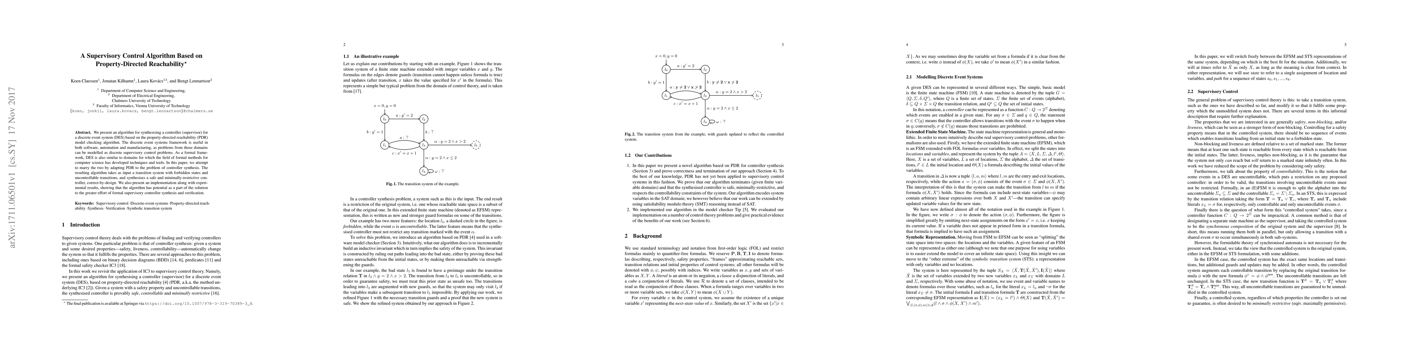 This paper introduces an algorithm for synthesizing a controller for discrete event systems based on property-directed reachability model checking. The algorithm aims to create a safe and minimally restrictive controller, demonstrating potential for formal supervisory control synthesis and verification through implementation and experimental results.