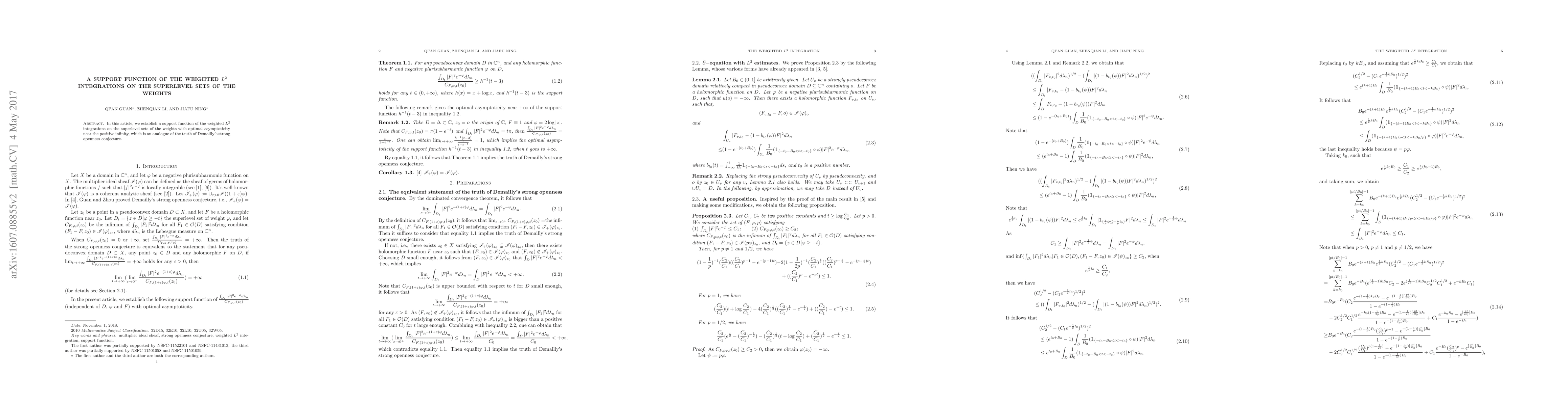 Summary: This paper establishes a support function for weighted $L^2$ integrations on superlevel sets of weights, achieving optimal asymptotic behavior near positive infinity, analogous to Demailly's strong openness conjecture.