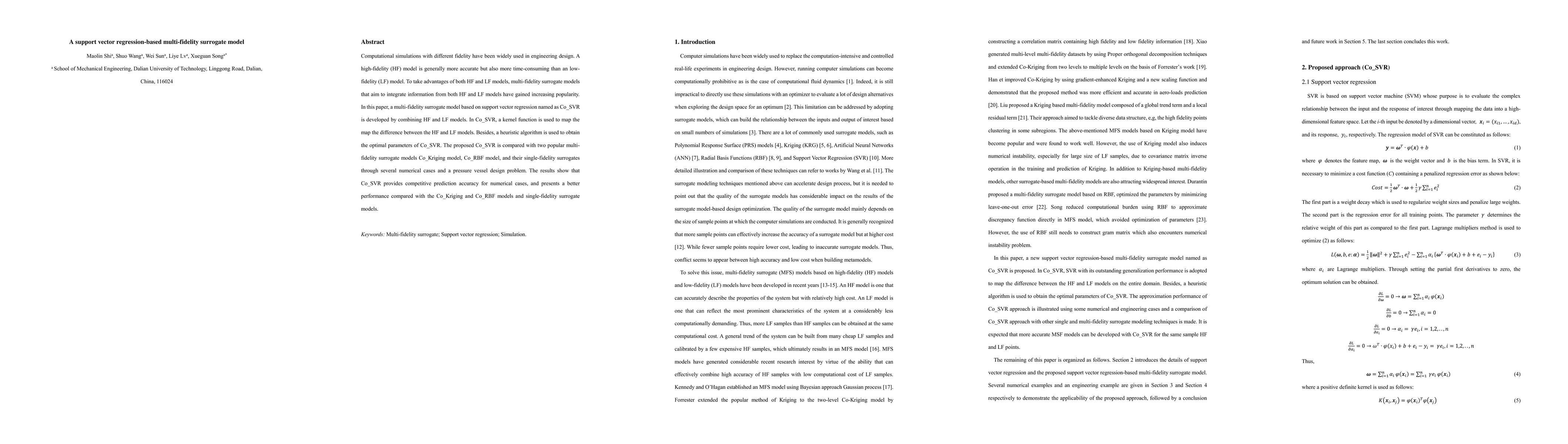 This paper develops a support vector regression-based multi-fidelity surrogate model, Co_SVR, to integrate both high-fidelity and low-fidelity models for engineering design. Co_SVR uses a kernel function and heuristic optimization to achieve optimal performance, outperforming Co_Kriging, Co_RBF, and single-fidelity models in numerical cases and a pressure vessel design problem.