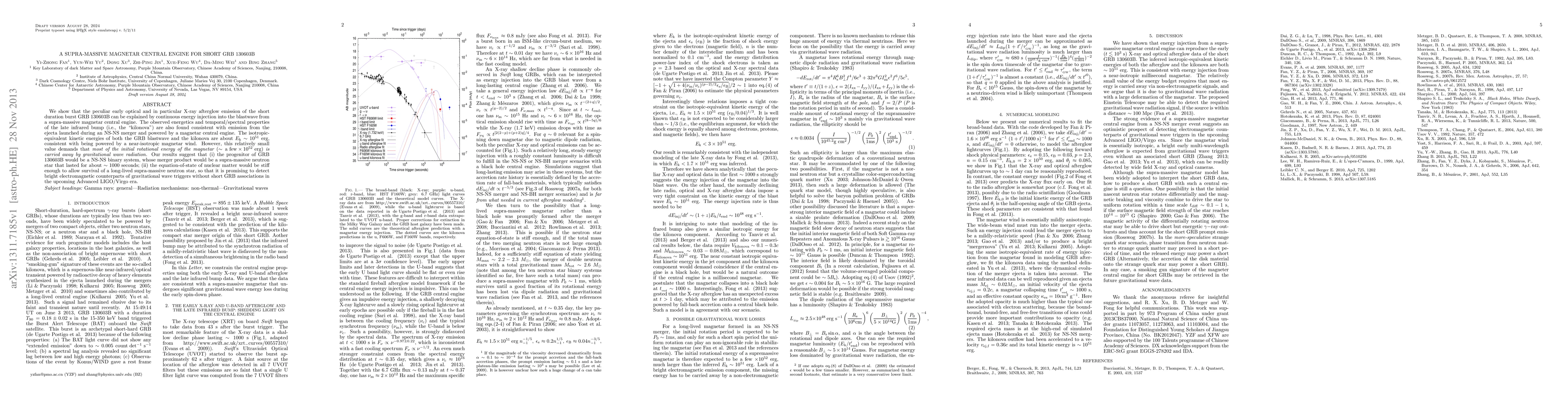 The paper presents a detailed analysis of GRB 130603B data, proposing a supra-massive magnetar central engine model to explain its early afterglow emission and kilonova bump.