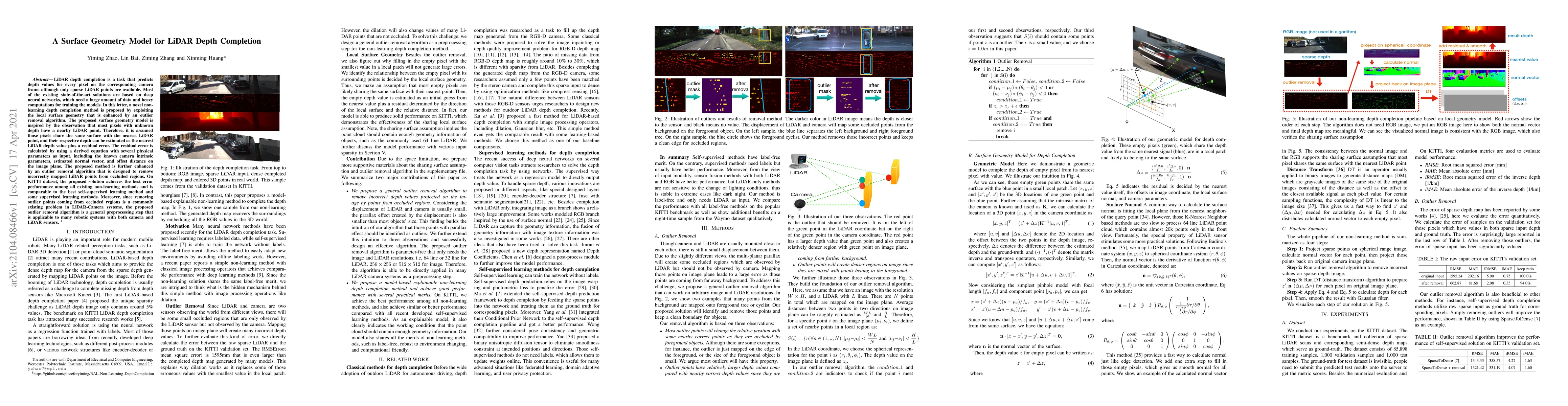 This paper proposes a non-learning depth completion method for LiDAR data by leveraging local surface geometry and an outlier removal algorithm, achieving competitive results on the KITTI dataset compared to learning-based methods. The method estimates depth values for pixels based on the nearest LiDAR point and a residual error derived from physical parameters.