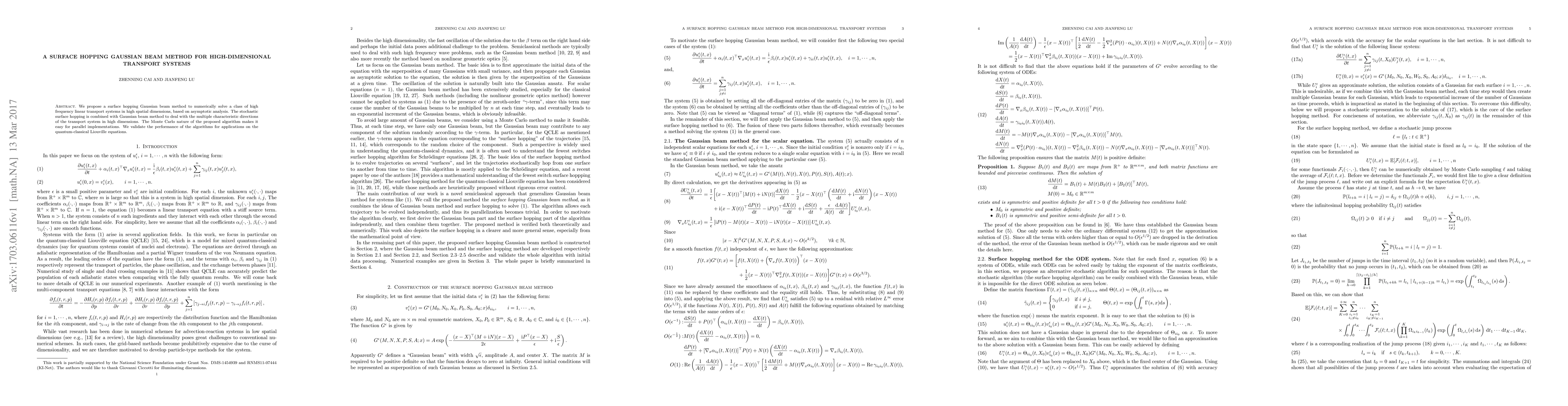 This paper introduces a surface hopping Gaussian beam method for solving high-frequency linear transport systems in high dimensions, employing stochastic surface hopping and Gaussian beams to manage multiple characteristic directions. The proposed Monte Carlo algorithm is validated for quantum-classical Liouville equations and is suitable for parallel implementation.