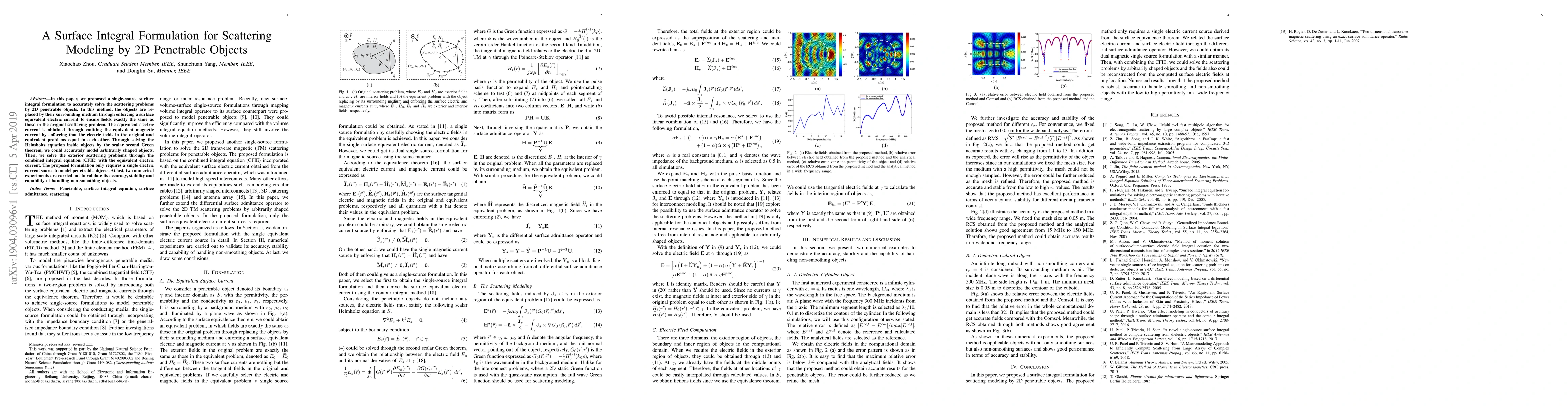 This paper introduces a surface integral formulation for modeling scattering by 2D penetrable objects using a single-source equivalent electric current. The method enforces equal electric fields in the original and equivalent problems, ensuring accurate modeling of arbitrarily shaped objects through the combined integral equation (CFIE). Numerical experiments validate the method's accuracy, stability, and ability to handle non-smooth objects.