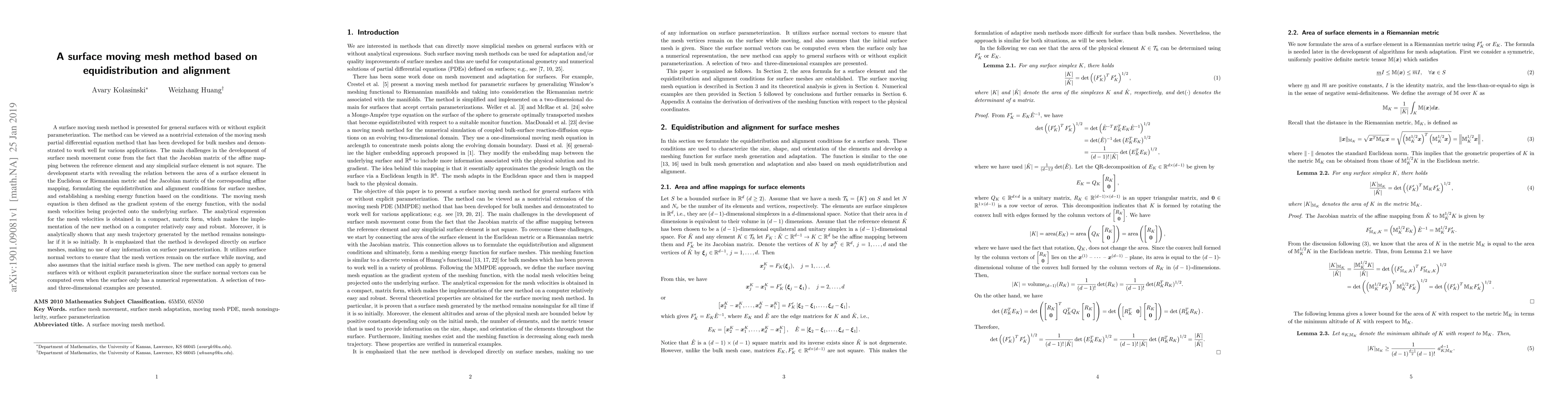 This paper introduces a surface moving mesh method based on equidistribution and alignment, extending the moving mesh PDE method for general surfaces without requiring explicit parameterization. The method projects nodal mesh velocities onto the surface while ensuring nonsingularity and maintaining mesh vertices on the surface using surface normal vectors.