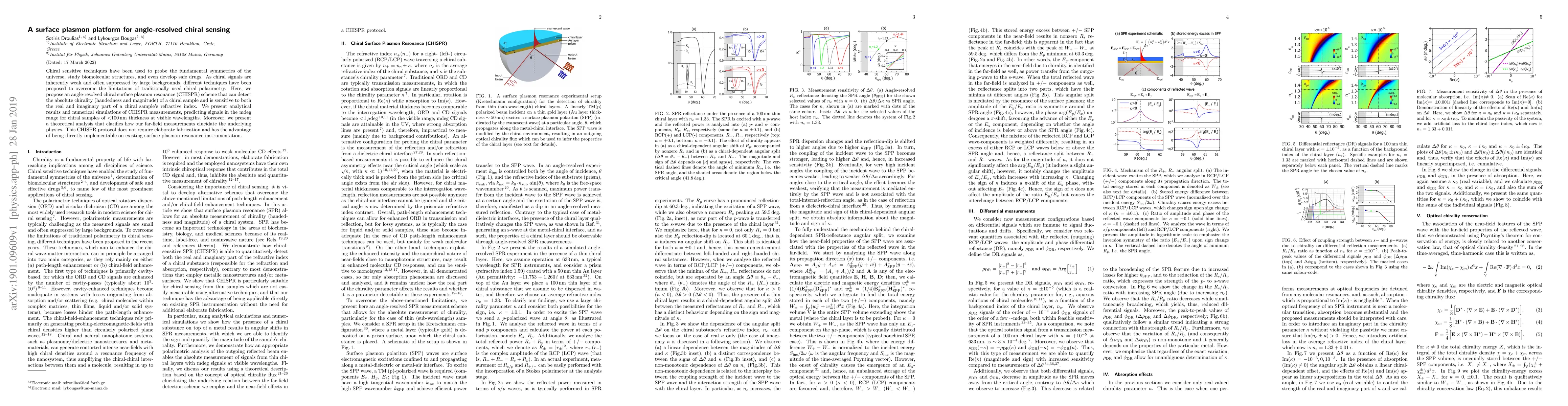 Chiral sensitive techniques have been used to probe the fundamental symmetries of the universe, study biomolecular structures, and even develop safe drugs. As chiral signals are inherently weak and often suppressed by large backgrounds, different techniques have been proposed to overcome the limitations of traditionally used chiral polarimetry. Here, we propose an angle-resolved chiral surface plasmon resonance (CHISPR) scheme that can detect the absolute chirality (handedness and magnitude) of a chiral sample and is sensitive to both the real and imaginary part of a chiral sample's refractive index. We present analytical results and numerical simulations of CHISPR measurements, predicting signals in the mdeg range for chiral samples of <100nm thickness at visible wavelengths. Moreover, we present a theoretical analysis that clarifies how our far-field measurements elucidate the underlying physics. This CHISPR protocol does not require elaborate fabrication and has the advantage of being directly implementable on existing surface plasmon resonance instrumentation.