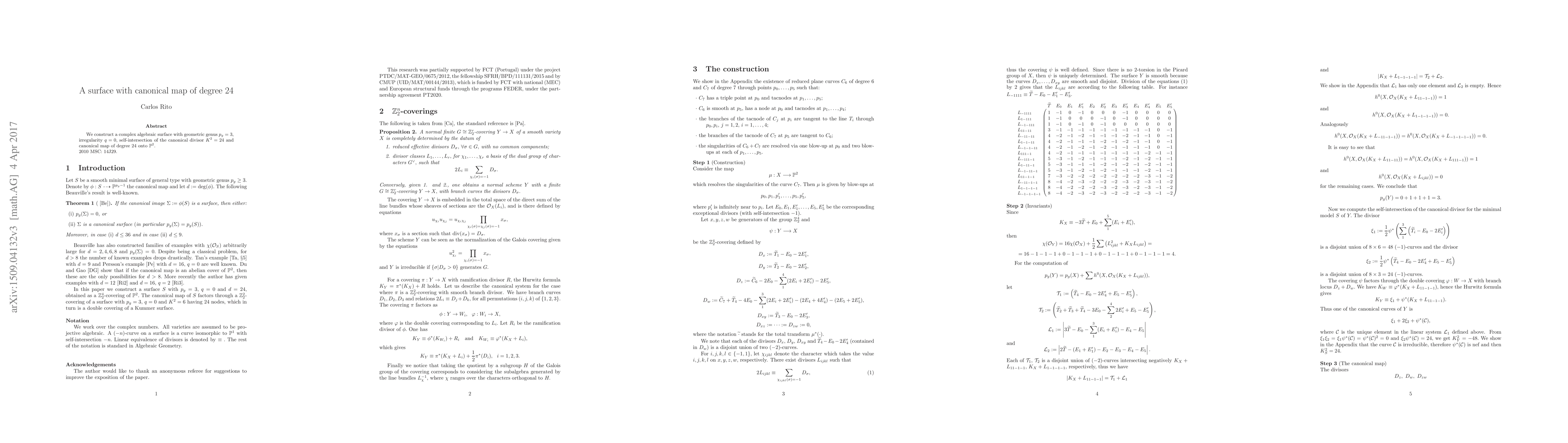 We construct a complex algebraic surface with geometric genus $p_g=3$, irregularity $q=0$, self-intersection of the canonical divisor $K^2=24$ and canonical map of degree $24$ onto $\mathbb P^2$.