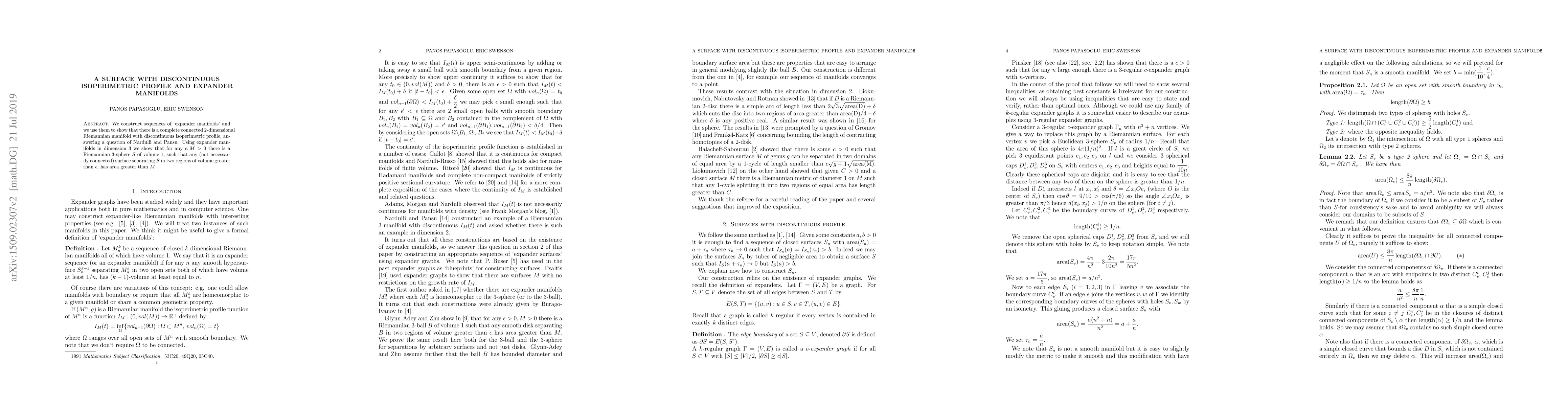 Researchers create a 2D manifold with a discontinuous isoperimetric profile and demonstrate its properties using expander manifolds, answering a long-standing question in mathematics. They also show that any surface separating a 3-sphere into two regions of volume greater than 0 can have an area greater than a given threshold.