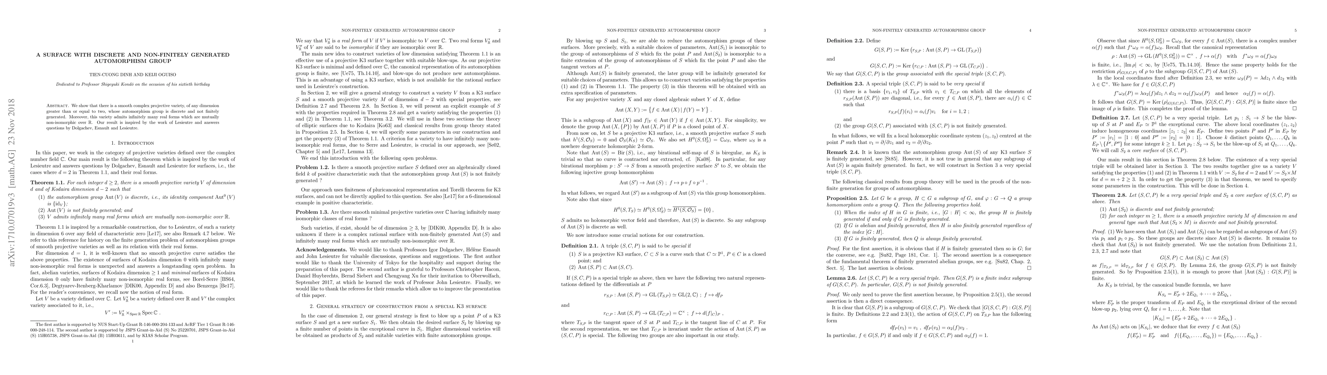 We show that there is a smooth complex projective variety, of any dimension greater than or equal to two, whose automorphism group is discrete and not finitely generated. Moreover, this variety admits infinitely many real forms which are mutually non-isomorphic over the real number field. Our result is inspired by the work of Lesieutre and answers questions by Dolgachev, Esnault and Lesieutre.