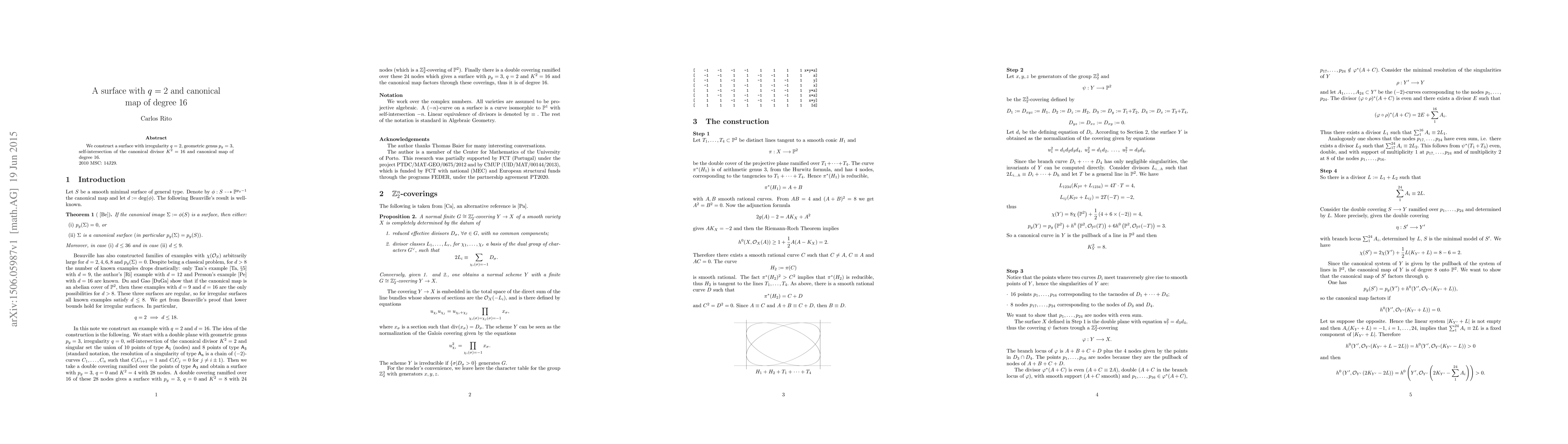 We construct a surface with irregularity $q=2,$ geometric genus $p_g=3,$ self-intersection of the canonical divisor $K^2=16$ and canonical map of degree $16.$