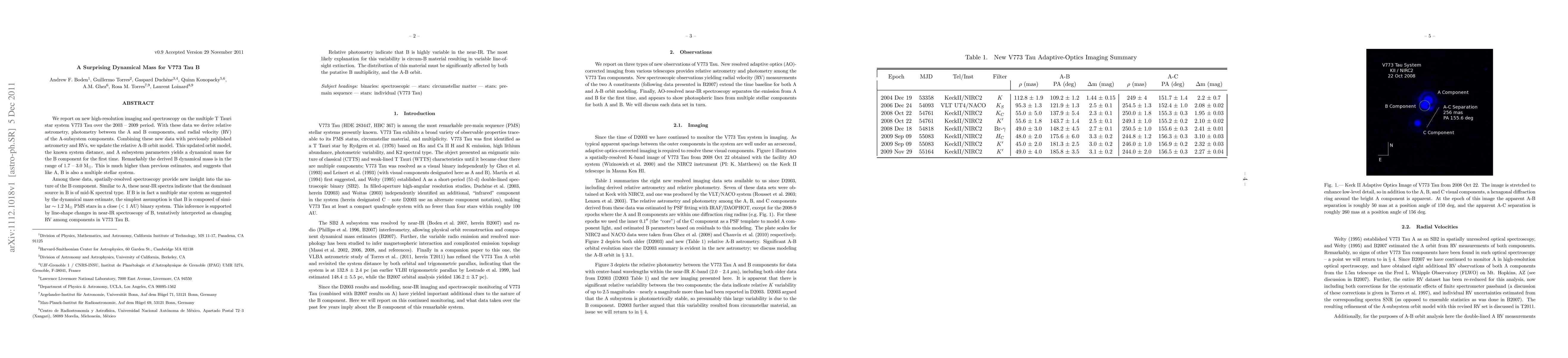We report on new high-resolution imaging and spectroscopy on the multiple T Tauri star system V773 Tau over the 2003 -- 2009 period. With these data we derive relative astrometry, photometry between the A and B components, and radial velocity (RV) of the A-subsystem components. Combining these new data with previously published astrometry and RVs, we update the relative A-B orbit model. This updated orbit model, the known system distance, and A subsystem parameters yields a dynamical mass for the B component for the first time. Remarkably the derived B dynamical mass is in the range of 1.7 -- 3.0 M$_\sun$. This is much higher than previous estimates, and suggests that like A, B is also a multiple stellar system. Among these data, spatially-resolved spectroscopy provide new insight into the nature of the B component. Similar to A, these near-IR spectra indicate that the dominant source in B is of mid-K spectral type. If B is in fact a multiple star system as suggested by the dynamical mass estimate, the simplest assumption is that B is composed of similar $\sim$ 1.2 M$_\sun$ PMS stars in a close ($<$ 1 AU) binary system. This inference is supported by line-shape changes in near-IR spectroscopy of B, tentatively interpreted as changing RV among components in V773 Tau B. Relative photometry indicate that B is highly variable in the near-IR. The most likely explanation for this variability is circum-B material resulting in variable line-of-sight extinction. The distribution of this material must be significantly affected by both the putative B multiplicity, and the A-B orbit.