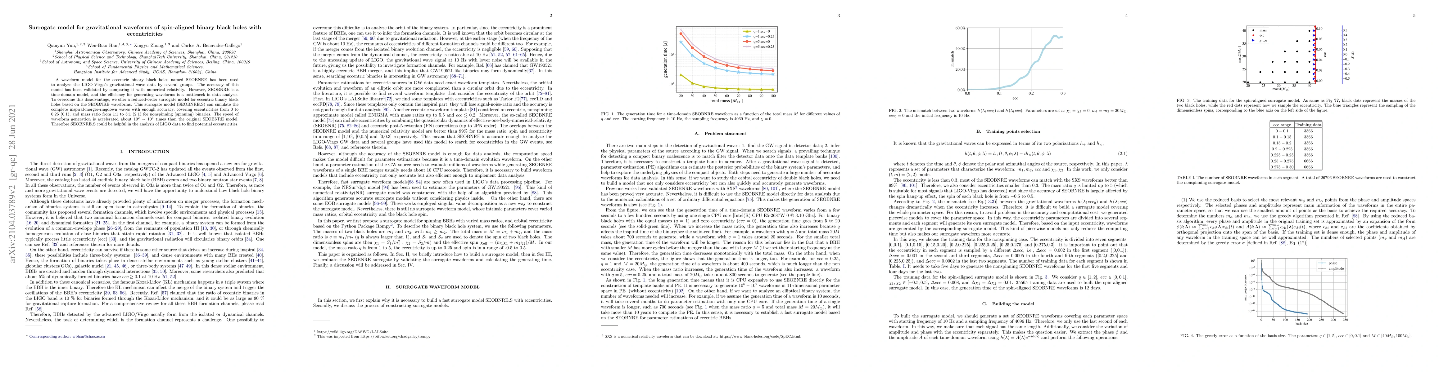 This paper introduces a reduced-order surrogate model, SEOBNRE_S, to efficiently generate gravitational waveforms for spin-aligned eccentric binary black holes, significantly speeding up the analysis of LIGO-Virgo data compared to the original SEOBNRE model. The surrogate model maintains accuracy while covering a range of eccentricities and mass ratios.